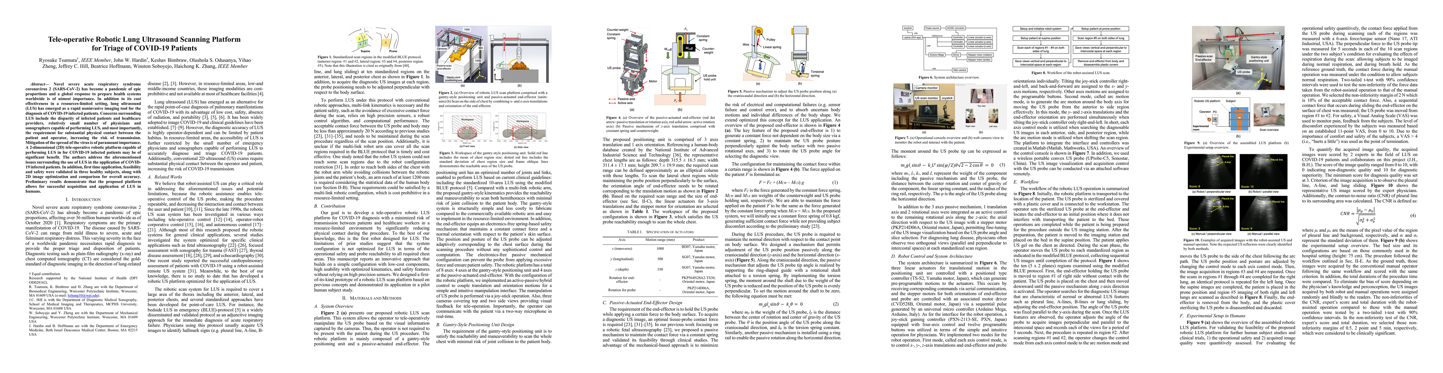 Novel severe acute respiratory syndrome coronavirus 2 (SARS-CoV-2) has become a pandemic of epic proportions and a global response to prepare health systems worldwide is of utmost importance. In addition to its cost-effectiveness in a resources-limited setting, lung ultrasound (LUS) has emerged as a rapid noninvasive imaging tool for the diagnosis of COVID-19 infected patients. Concerns surrounding LUS include the disparity of infected patients and healthcare providers, relatively small number of physicians and sonographers capable of performing LUS, and most importantly, the requirement for substantial physical contact between the patient and operator, increasing the risk of transmission. Mitigation of the spread of the virus is of paramount importance. A 2-dimensional (2D) tele-operative robotic platform capable of performing LUS in for COVID-19 infected patients may be of significant benefit. The authors address the aforementioned issues surrounding the use of LUS in the application of COVID- 19 infected patients. In addition, first time application, feasibility and safety were validated in three healthy subjects, along with 2D image optimization and comparison for overall accuracy. Preliminary results demonstrate that the proposed platform allows for successful acquisition and application of LUS in humans.