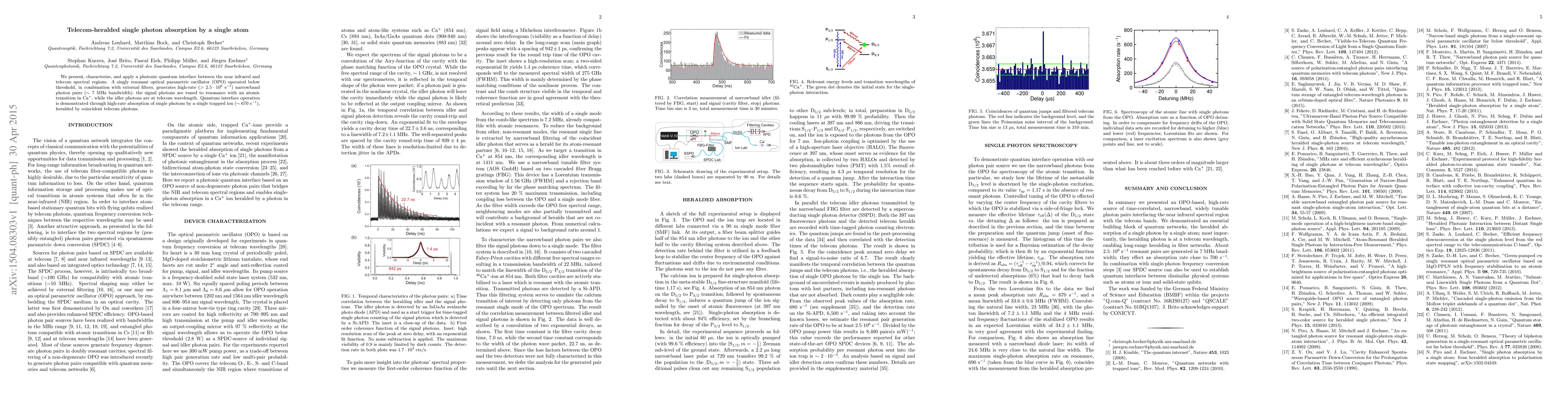 This paper develops a photonic quantum interface that connects the near-infrared to the telecom spectral regions, using a singly resonant optical parametric oscillator to generate photon pairs. The telecom idler photons are used to herald the absorption of single photons by a single trapped Ca$^+$ ion, demonstrating efficient quantum interface operation.