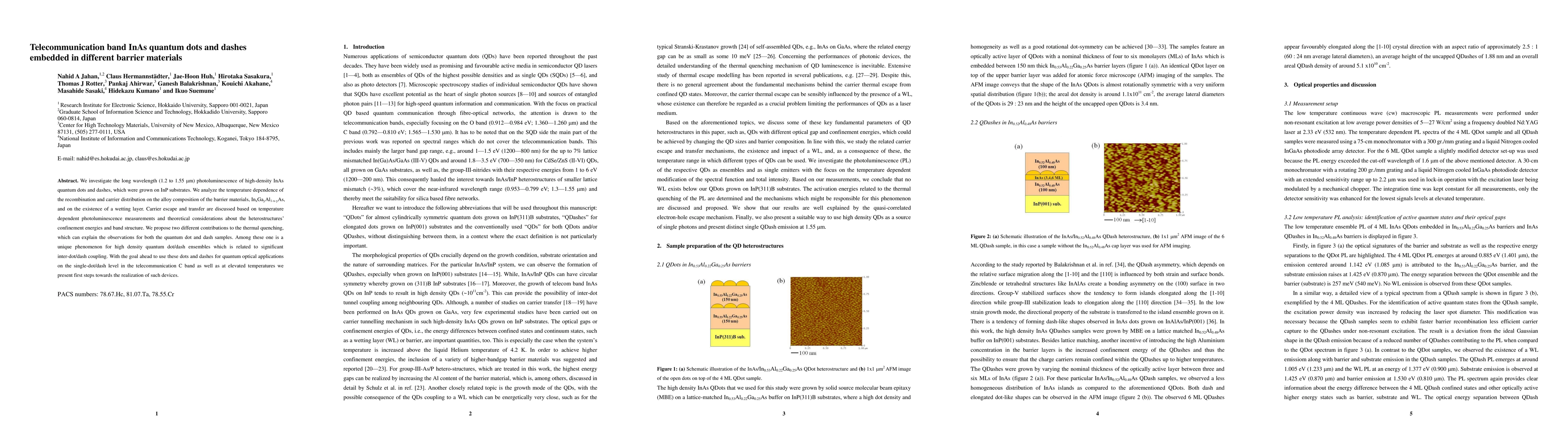 This paper investigates the long-wavelength photoluminescence of high-density InAs quantum dots and dashes embedded in different barrier materials, focusing on the temperature dependence of recombination and carrier distribution. The study proposes two mechanisms for thermal quenching, including a unique inter-dot coupling phenomenon, and outlines initial steps towards quantum optical applications in the telecommunication C band.