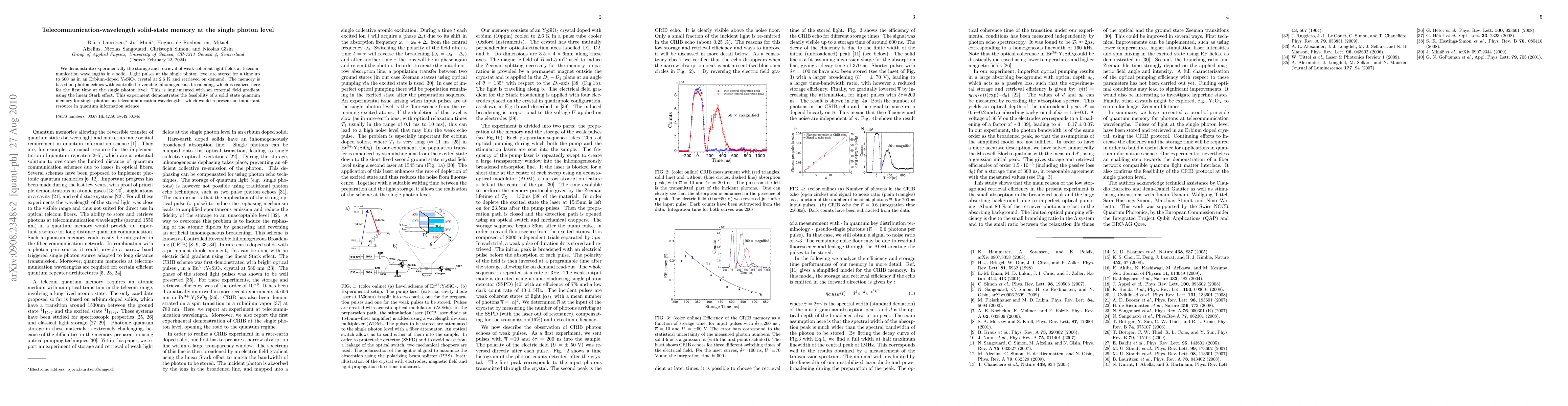 This paper demonstrates the storage and retrieval of single-photon light pulses at telecommunication wavelengths in an Erbium-doped Y$_2$SiO$_5$ crystal at 2.6 K, using photon echoes and controlled reversible inhomogeneous broadening via the linear Stark effect. This solid-state quantum memory represents a significant step towards quantum information science applications.