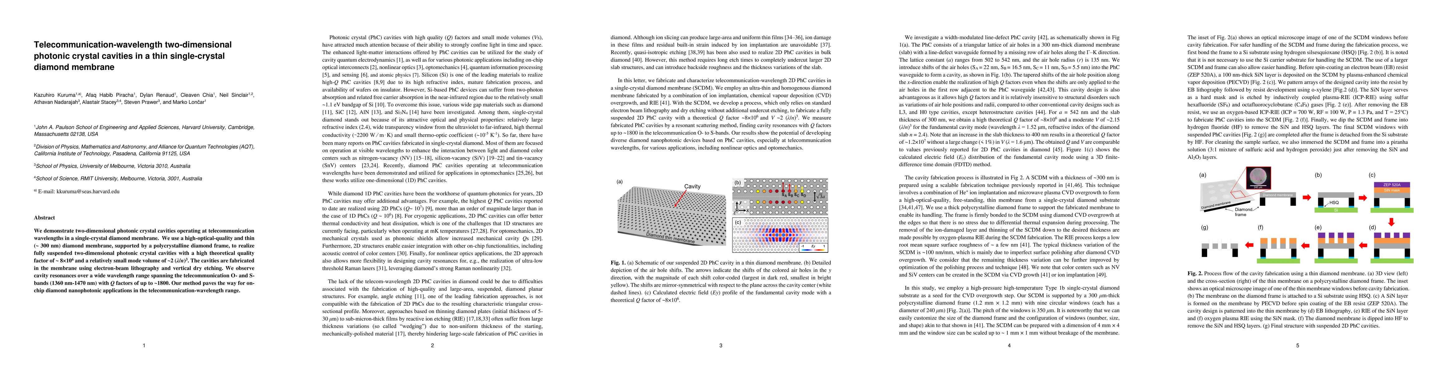 This paper demonstrates high-quality two-dimensional photonic crystal cavities in a thin single-crystal diamond membrane for telecommunication wavelengths, achieving a theoretical quality factor of $8\times10^6$ and Q factors up to 1800, paving the way for on-chip diamond nanophotonic applications.
