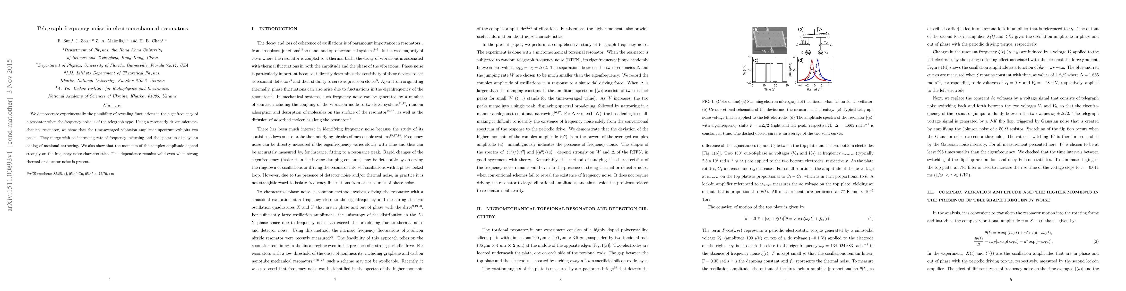 We demonstrate experimentally the possibility of revealing fluctuations in the eigenfrequency of a resonator when the frequency noise is of the telegraph type. Using a resonantly driven micromechanical resonator, we show that the time-averaged vibration amplitude spectrum exhibits two peaks. They merge with an increasing rate of frequency switching and the spectrum displays an analog of motional narrowing. We also show that the moments of the complex amplitude depend strongly on the frequency noise characteristics. This dependence remains valid even when strong thermal or detector noise is present.