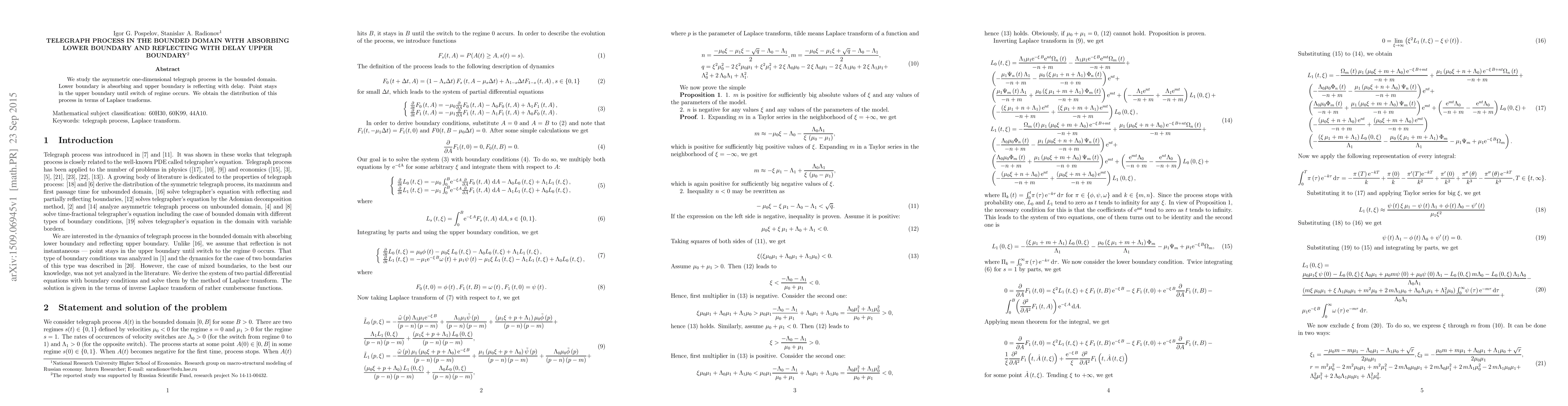 This paper studies a one-dimensional telegraph process with an absorbing lower boundary and a reflecting upper boundary with delay, and finds the distribution of the process using Laplace transforms.