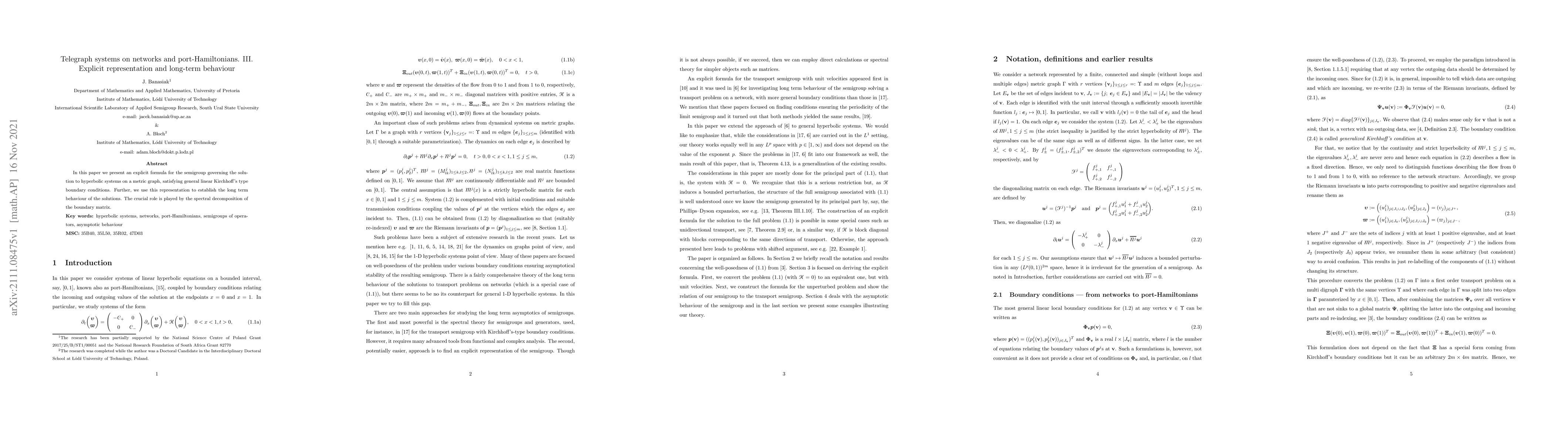 In this paper we present an explicit formula for the semigroup governing the solution to hyperbolic systems on a metric graph, satisfying general linear Kirchhoff's type boundary conditions. Further, we use this representation to establish the long term behaviour of the solutions. The crucial role is played by the spectral decomposition of the boundary matrix.