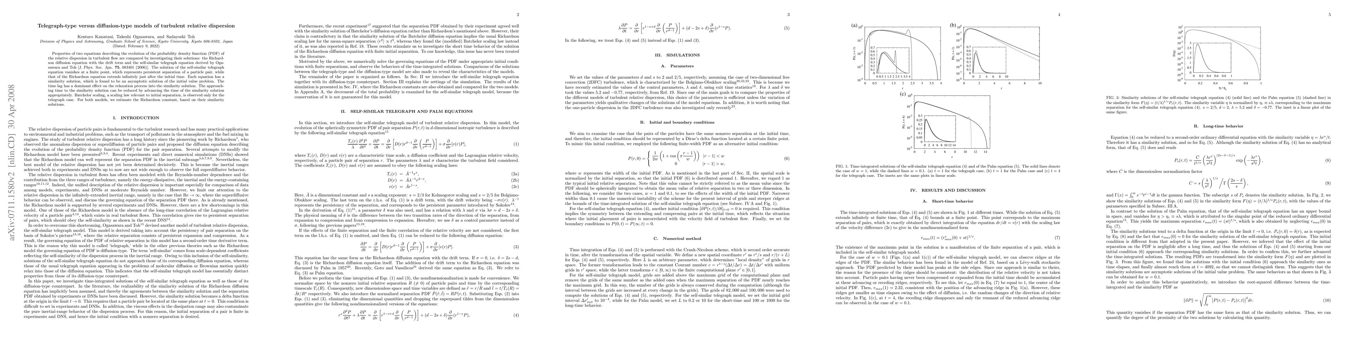 Two models of turbulent relative dispersion, the Richardson diffusion equation with a drift term and the self-similar telegraph equation, were compared to find their solutions, which differ in how they describe particle separation over time.
