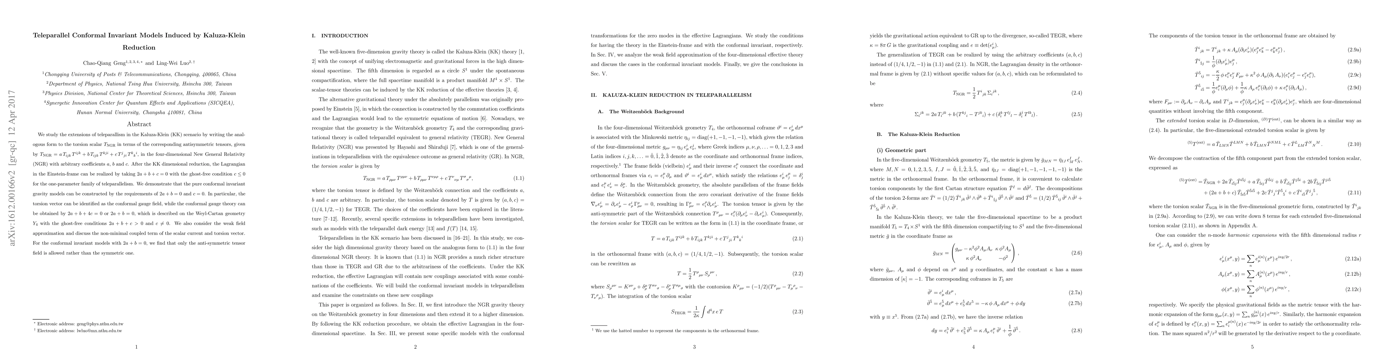 We study the extensions of teleparallism in the Kaluza-Klein (KK) scenario by writing the analogous form to the torsion scalar $T_{\text{NGR}}$ in terms of the corresponding antisymmetric tensors, given by $T_{\text{NGR}} = a\,T_{ijk} \, T^{ijk} + b\,T_{ijk} \,T^{kji} + c\,T^{j}{}_{ji} \, T^{k}{}_{k}{}^{i}$, in the four-dimensional New General Relativity (NGR) with arbitrary coefficients $a$, $b$ and $c$. After the KK dimensional reduction, the Lagrangian in the Einstein-frame can be realized by taking $2a+b+c=0$ with the ghost-free condition $c\leq0$ for the one-parameter family of teleparallelism. We demonstrate that the pure conformal invariant gravity models can be constructed by the requirements of $2a+b=0$ and $c=0$. In particular, the torsion vector can be identified as the conformal gauge field, while the conformal gauge theory can be obtained by $2a+b+4c=0$ or $2a+b=0$, which is described on the Weyl-Cartan geometry $Y_4$ with the ghost-free conditions $2a+b+c>0$ and $c\neq0$. We also consider the weak field approximation and discuss the non-minimal coupled term of the scalar current and torsion vector. For the conformal invariant models with $2a+b=0$, we find that only the anti-symmetric tensor field is allowed rather than the symmetric one.