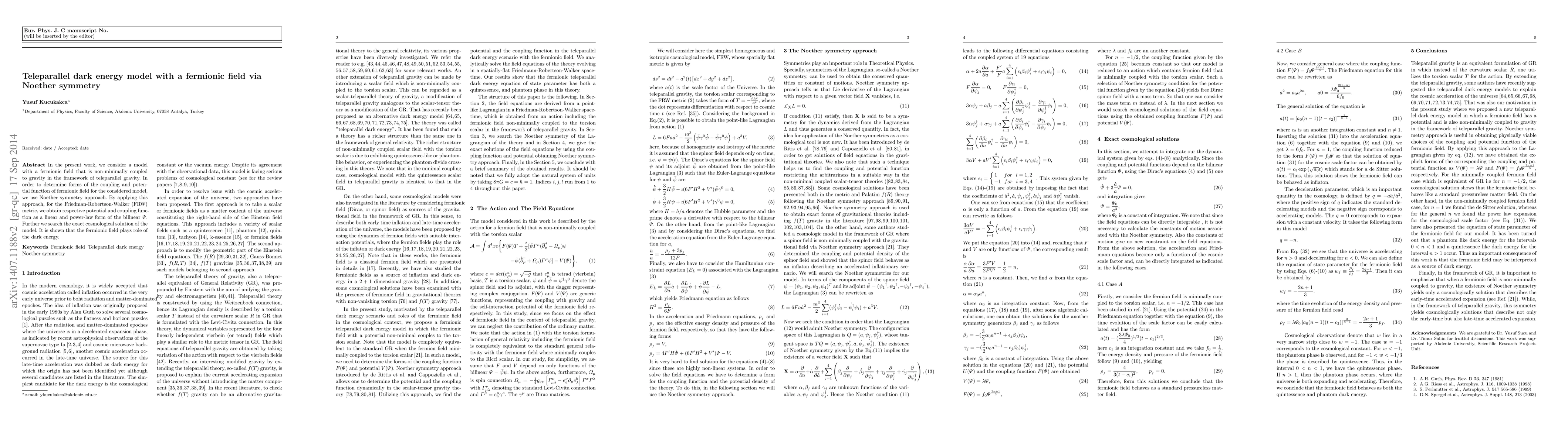In the present work, we consider a model with a fermionic field that is non-minimally coupled to gravity in the framework of teleparallel gravity. In order to determine forms of the coupling and potential function of fermionic field for the considered model, we use Noether symmetry approach. By applying this approach, for the Friedman-Robertson-Walker metric, we obtain respective potential and coupling function as a linear and power-law form of the bilinear $\Psi$. Further we search the exact cosmological solution of the model. It is shown that the fermionic field plays role of the dark energy.