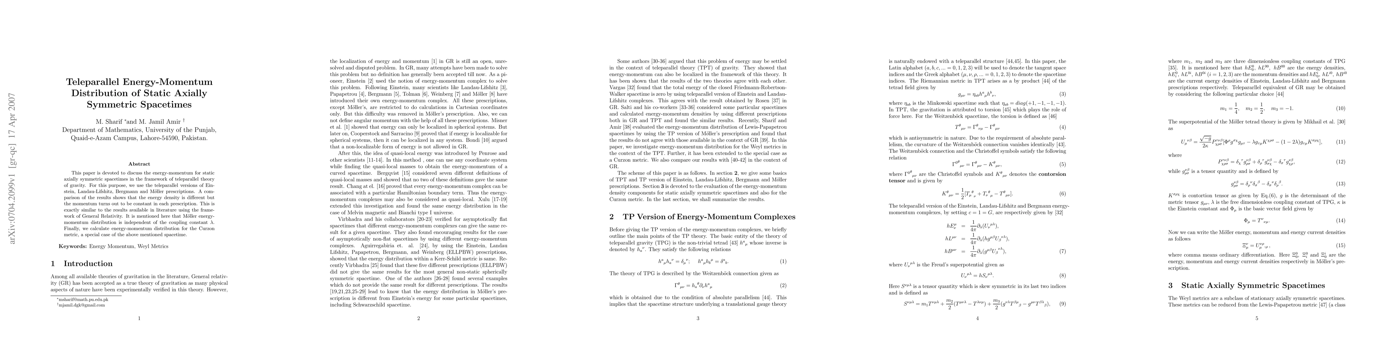 This paper examines the energy-momentum distribution in static axially symmetric spacetimes using teleparallel gravity, comparing results from various prescriptions. Despite differences in energy density, the momentum remains constant across prescriptions, mirroring findings from General Relativity, and the M$\ddot{o}$ller distribution is noted to be independent of the coupling constant $\lambda$. The Curzon metric is specifically analyzed for its energy-momentum distribution.
