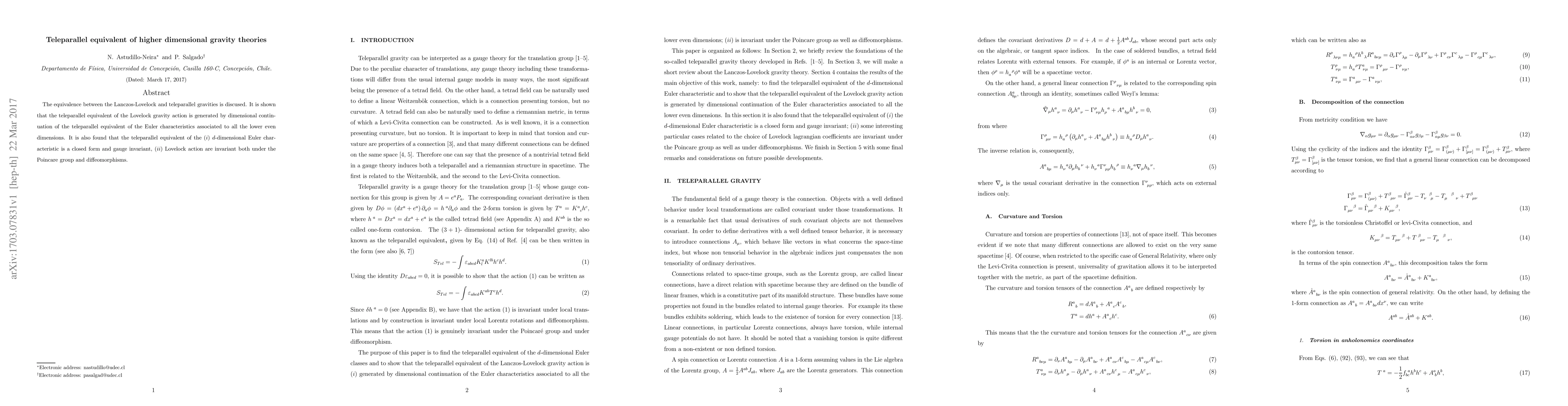 The equivalence between the Lanczos-Lovelock and teleparallel gravities is discused. It is shown that the teleparallel equivalent of the Lovelock gravity action is generated by dimensional continuation of the teleparallel equivalent of the Euler characteristics associated to all the lower even dimensions. It is also found that the teleparallel equivalent of the (i) d-dimensional Euler characteristic is a closed form and gauge invariant, (ii) Lovelock action are invariant both under the Poincare group and diffeomorphisms.