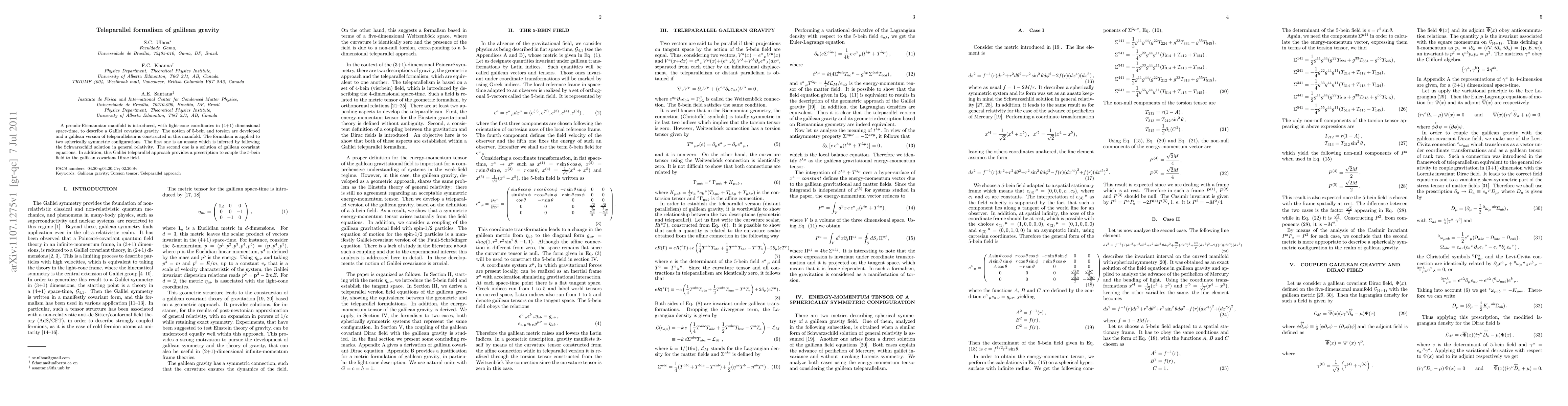 This paper introduces a Galilei covariant gravity using a pseudo-Riemannian manifold with light-cone coordinates and develops a 5-bein and torsion-based teleparallelism. It applies this formalism to two spherically symmetric configurations, including a modified Schwarzschild solution and a new Galilei covariant equation solution, and outlines coupling the 5-bein field to the galilean covariant Dirac field.