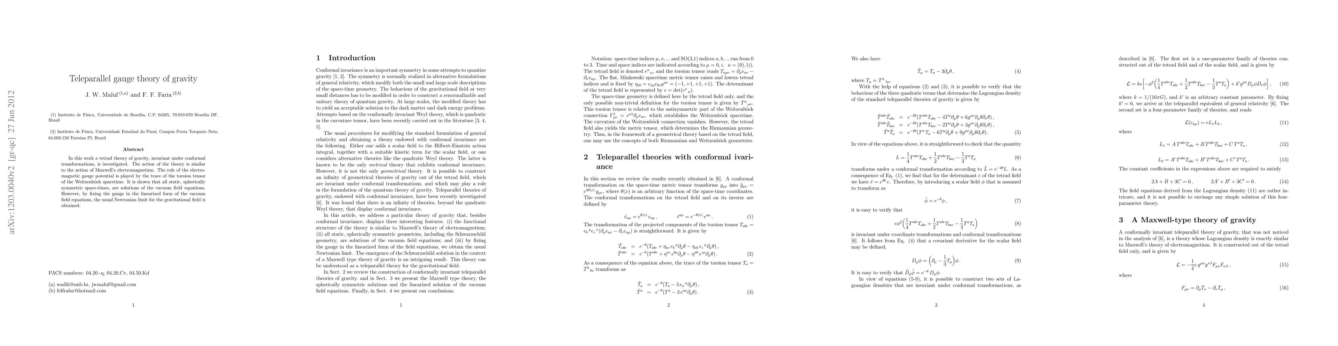 In this work a tetrad theory of gravity, invariant under conformal transformations, is investigated. The action of the theory is similar to the action of Maxwell's electromagnetism. The role of the electromagnetic gauge potential is played by the trace of the torsion tensor of the Weitzenb\"ock spacetime. It is shown that all static, spherically symmetric space-times, are solutions of the vacuum field equations. However, by fixing the gauge in the linearized form of the vacuum field equations, the usual Newtonian limit for the gravitational field is obtained.