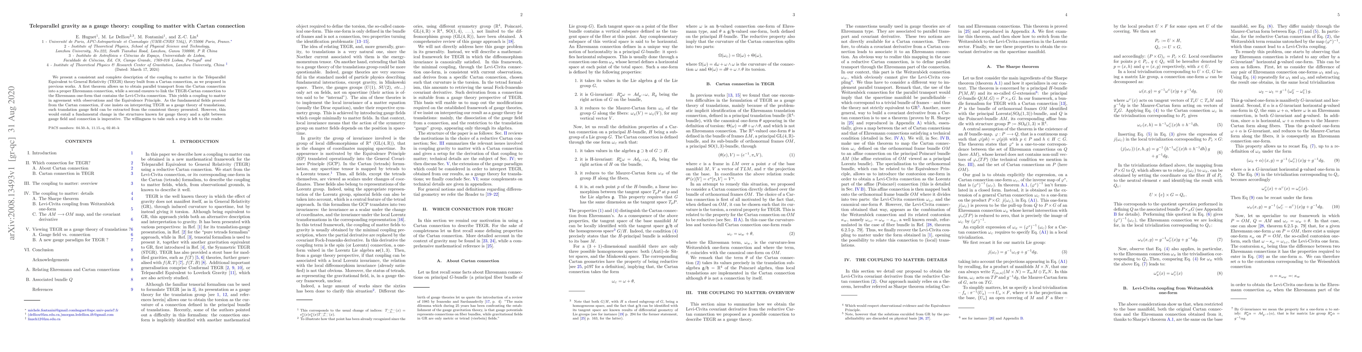 We present a consistent and complete description of the coupling to matter in the Teleparallel Equivalent to General Relativity (TEGR) theory built from a Cartan connection, as we proposed in previous works. A first theorem allows us to obtain parallel transport from the Cartan connection into a proper Ehresmann connection, while a second ensures to link the TEGR-Cartan connection to the Ehresmann one-form that contains the Levi-Civita connection. This yields a coupling to matter in agreement with observations and the Equivalence Principle. As the fundamental fields proceed from the Cartan connection, if one insists on interpreting TEGR as a gauge theory of translations, such translation gauge field can be extracted from the consistent theory presented. However, this would entail a fundamental change in the structures known for gauge theory and a split between gauge field and connection is imperative. The willingness to take such a step is left to the reader.