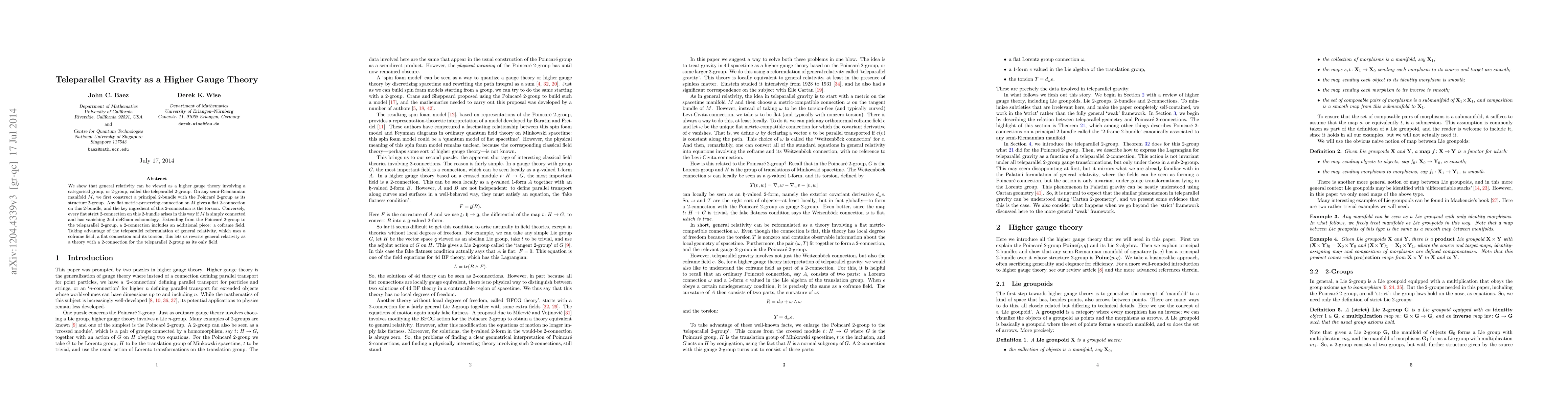We show that general relativity can be viewed as a higher gauge theory involving a categorical group, or 2-group, called the teleparallel 2-group. On any semi-Riemannian manifold M, we first construct a principal 2-bundle with the Poincare 2-group as its structure 2-group. Any flat metric-preserving connection on M gives a flat 2-connection on this 2-bundle, and the key ingredient of this 2-connection is the torsion. Conversely, every flat strict 2-connection on this 2-bundle arises in this way if M is simply connected and has vanishing 2nd deRham cohomology. Extending from the Poincare 2-group to the teleparallel 2-group, a 2-connection includes an additional piece: a coframe field. Taking advantage of the teleparallel reformulation of general relativity, which uses a coframe field, a flat connection and its torsion, this lets us rewrite general relativity as a theory with a 2-connection for the teleparallel 2-group as its only field.