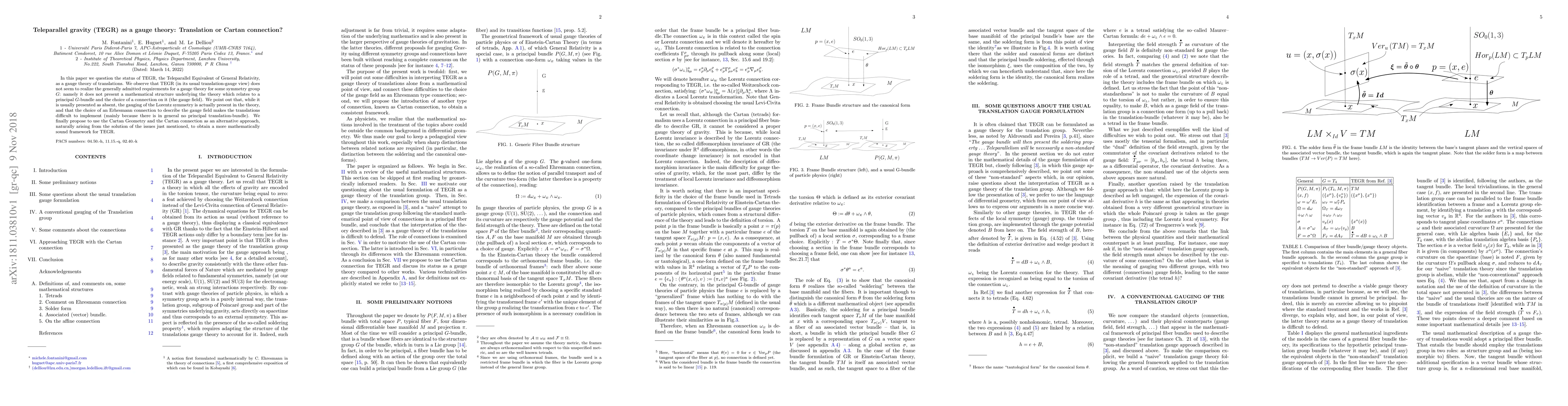 In this paper we question the status of TEGR, the Teleparallel Equivalent of General Relativity,as a gauge theory of translations. We observe that TEGR (in its usual translation-gauge view) does not seem to realize the generally admitted requirements for a gauge theory for some symmetry group $G$: namely it does not present a mathematical structure underlying the theory which relates to a principal $G$-bundle and the choice of a connection on it (the gauge field). We point out that, while it is usually presented as absent, the gauging of the Lorentz symmetry is actually present in the theory, and that the choice of an Erhesmann connection to describe the gauge field makes the translations difficult to implement (mainly because there is in general no principal translation-bundle). We finally propose to use the Cartan Geometry and the Cartan connection as an alternative approach, naturally arising from the solution of the issues just mentioned, to obtain a more mathematically sound framework for TEGR.