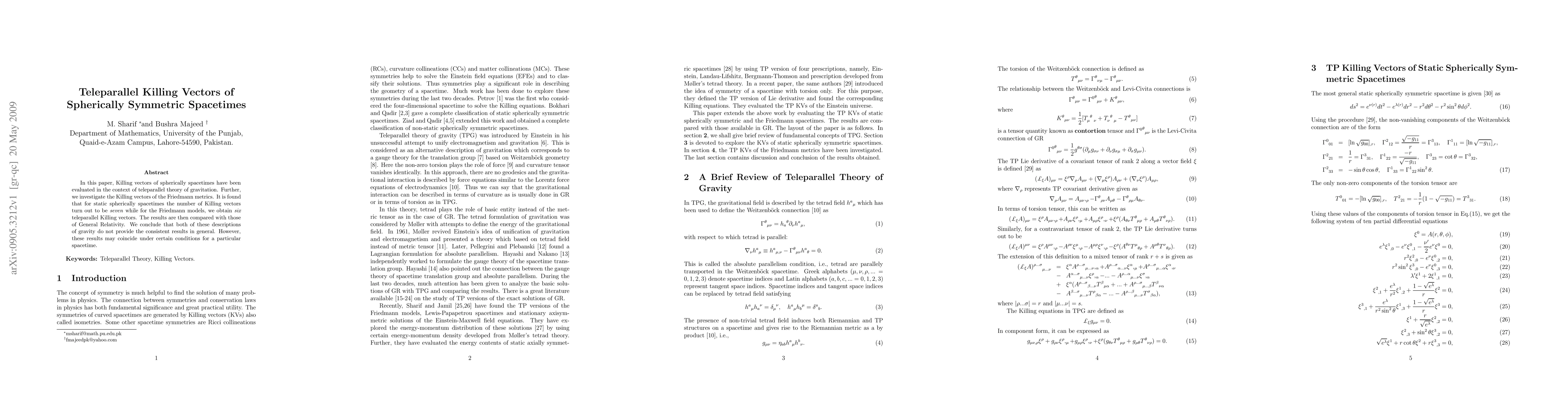 This paper evaluates the Killing vectors of spherically symmetric spacetimes within the framework of teleparallel theory of gravitation, identifying seven for static cases and six for Friedmann models. Comparisons with General Relativity show that the two frameworks generally yield inconsistent results, though they may align under specific spacetime conditions.