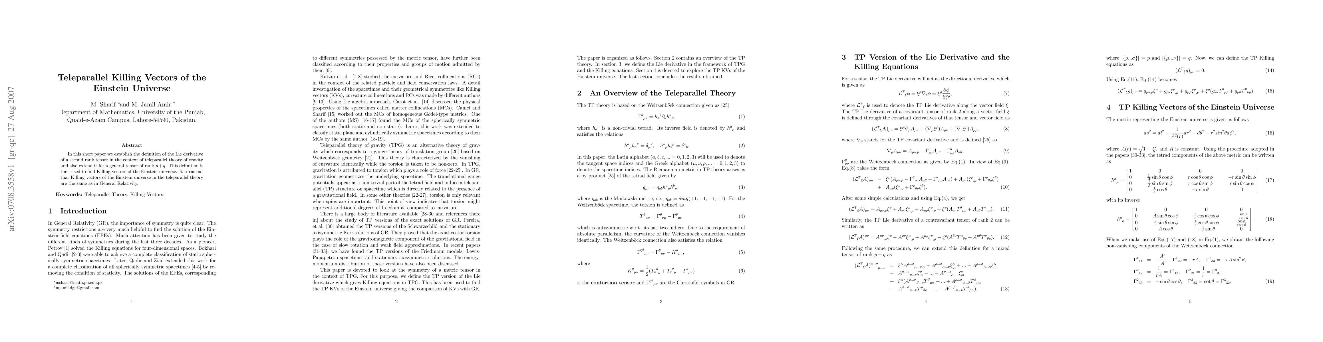 This paper defines the Lie derivative for tensors in teleparallel gravity and applies it to find Killing vectors in the Einstein universe, showing they are identical to those in General Relativity.