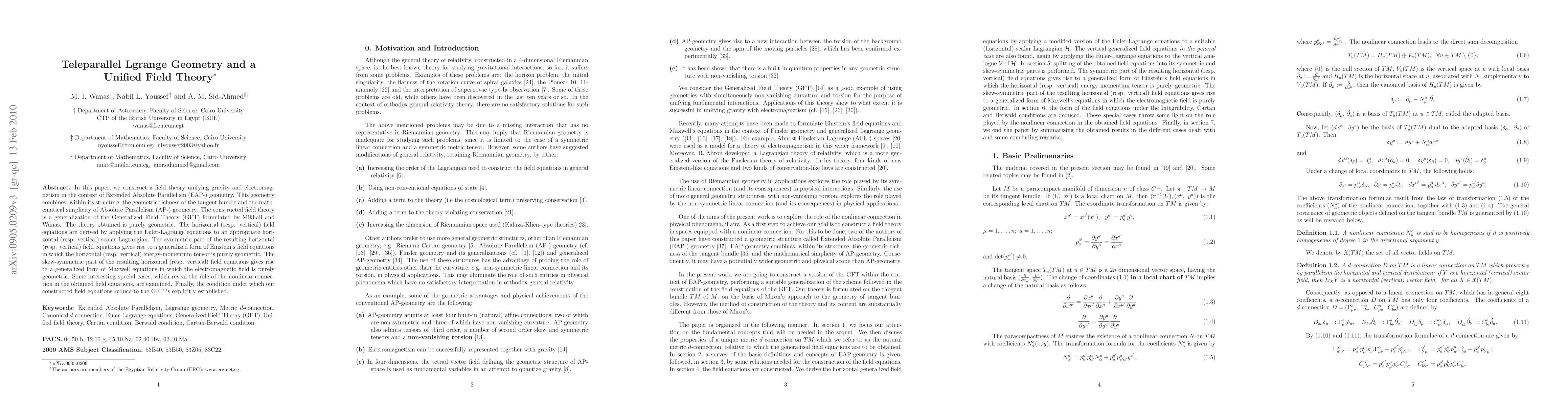 This paper constructs a unified field theory combining gravity and electromagnetism using Extended Absolute Parallelism geometry, generalizing the Generalized Field Theory. The theory yields geometric forms of Einstein's and Maxwell's equations through horizontal and vertical field equations derived from scalar Lagrangians.