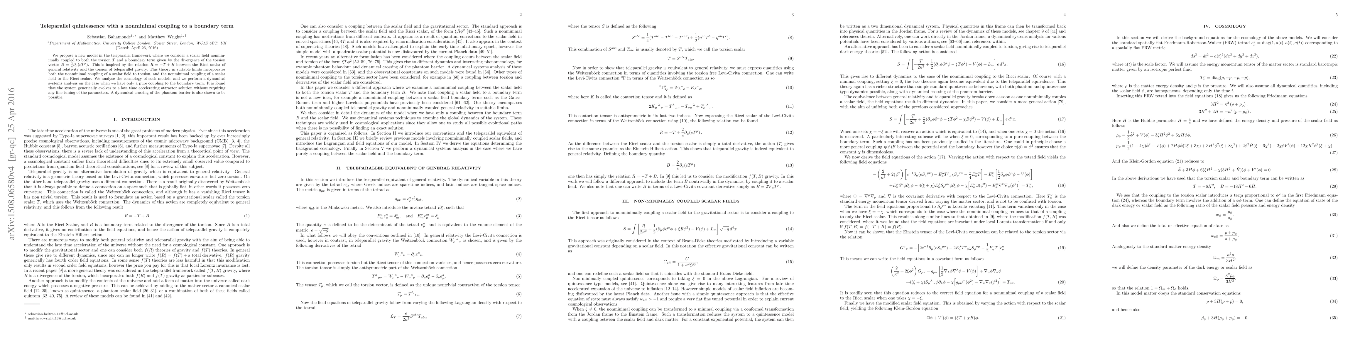 We propose a new model in the teleparallel framework where we consider a scalar field nonminimally coupled to both the torsion $T$ and a boundary term given by the divergence of the torsion vector $B=\frac{2}{e}\partial_\mu (eT^\mu)$. This is inspired by the relation $R=-T+B$ between the Ricci scalar of general relativity and the torsion of teleparallel gravity. This theory in suitable limits incorporates both the nonminimal coupling of a scalar field to torsion, and the nonminimal coupling of a scalar field to the Ricci scalar. We analyse the cosmology of such models, and we perform a dynamical systems analysis on the case when we have only a pure coupling to the boundary term. It is found that the system generically evolves to a late time accelerating attractor solution without requiring any fine tuning of the parameters. A dynamical crossing of the phantom barrier is also shown to be possible.