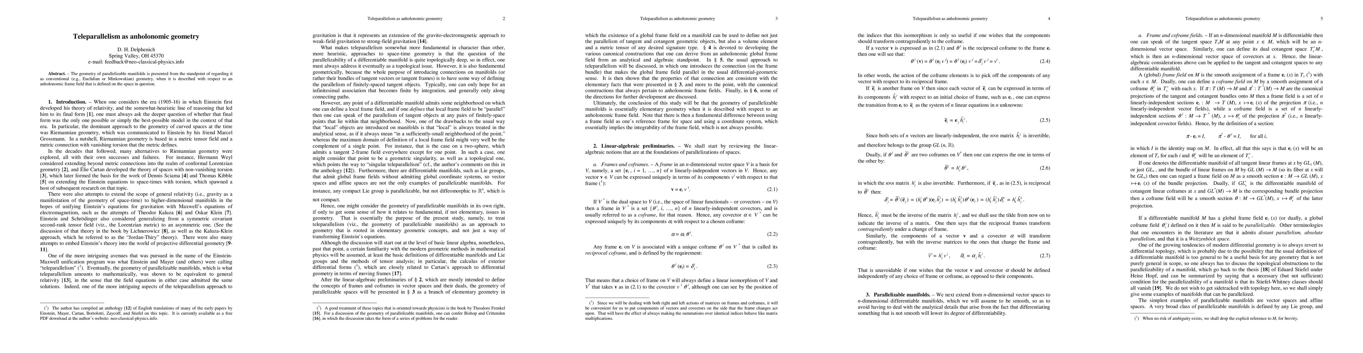 This paper presents teleparallelism as anholonomic geometry, describing parallelizable manifolds in terms of a non-Euclidean frame field that preserves the metric tensor.