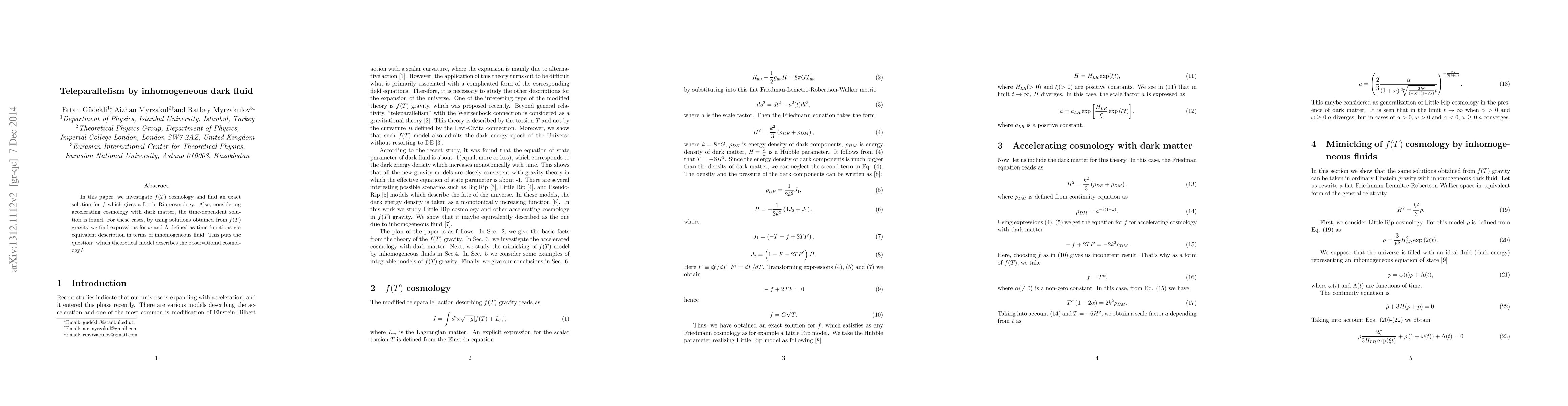 This paper explores $f(T)$ cosmology, deriving an exact solution leading to Little Rip cosmology, and finds a time-dependent solution for accelerating universe with dark matter. It correlates these $f(T)$ gravity solutions with inhomogeneous dark fluid, questioning which model best fits observational cosmology.
