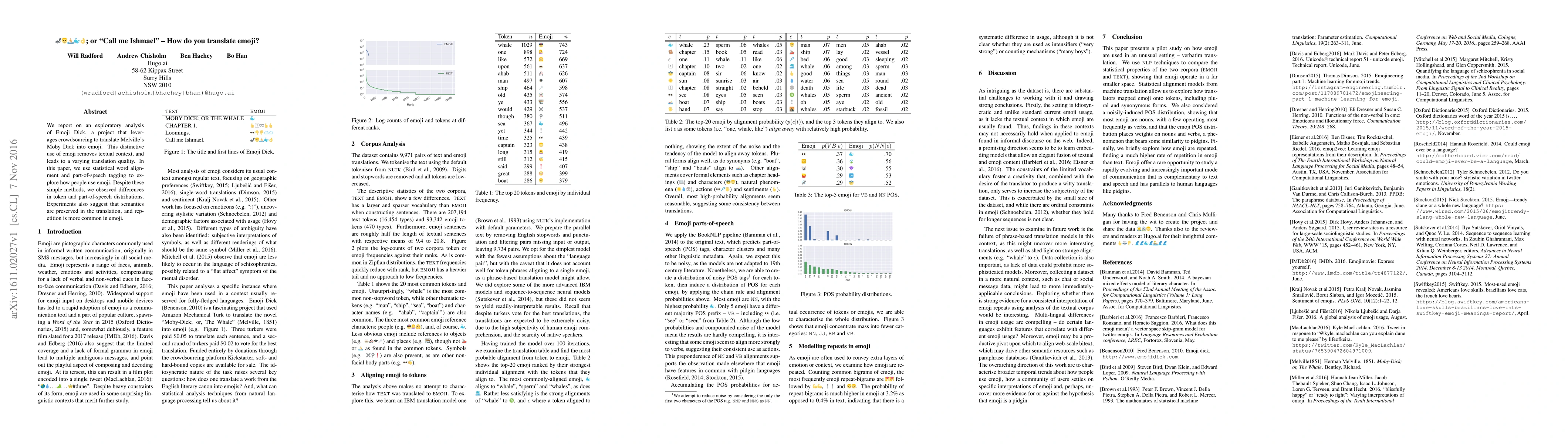 We report on an exploratory analysis of Emoji Dick, a project that leverages crowdsourcing to translate Melville's Moby Dick into emoji. This distinctive use of emoji removes textual context, and leads to a varying translation quality. In this paper, we use statistical word alignment and part-of-speech tagging to explore how people use emoji. Despite these simple methods, we observed differences in token and part-of-speech distributions. Experiments also suggest that semantics are preserved in the translation, and repetition is more common in emoji.