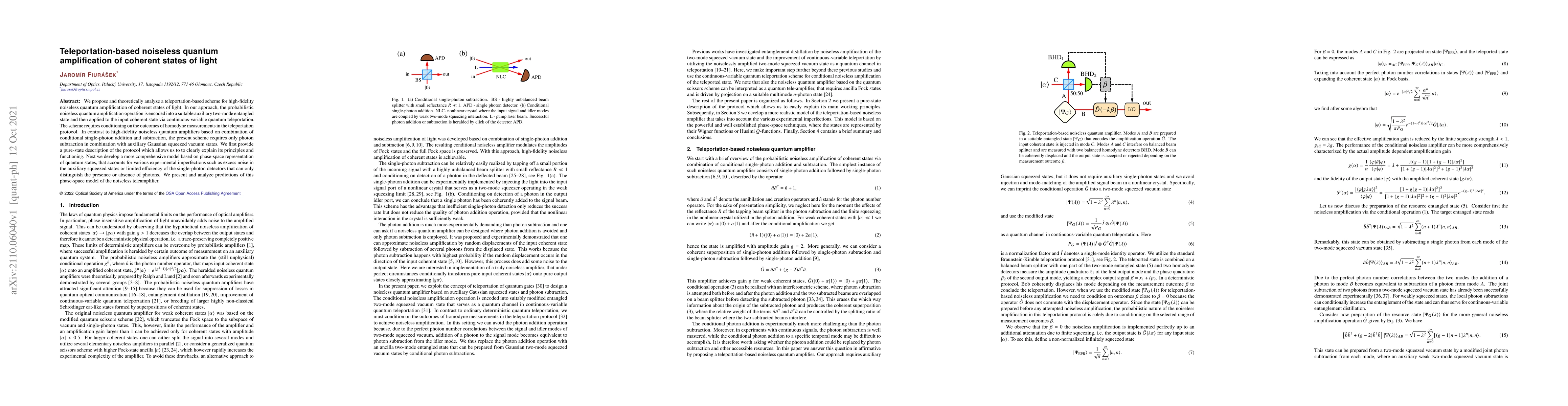 The paper presents a novel teleportation-based noiseless quantum amplification scheme for coherent states of light, utilizing photon subtraction and auxiliary Gaussian squeezed vacuum states, which simplifies the setup compared to previous methods.