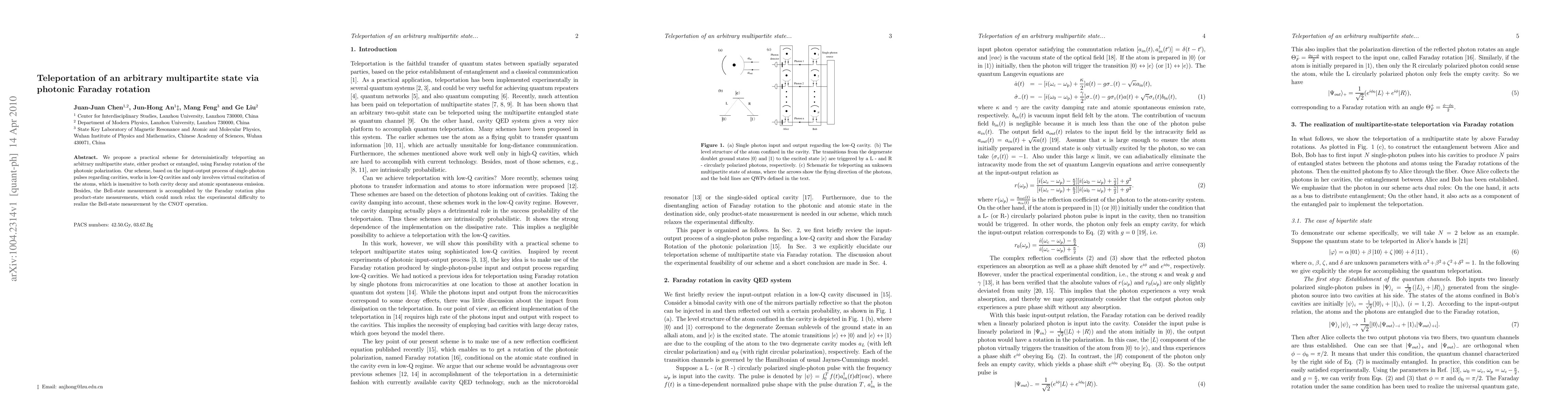 The research proposes a practical scheme for deterministically teleporting an arbitrary multipartite state using Faraday rotation of photonic polarization, based on input-output processes in low-Q cavities with virtual atom excitation, insensitive to cavity decay and atomic spontaneous emission.