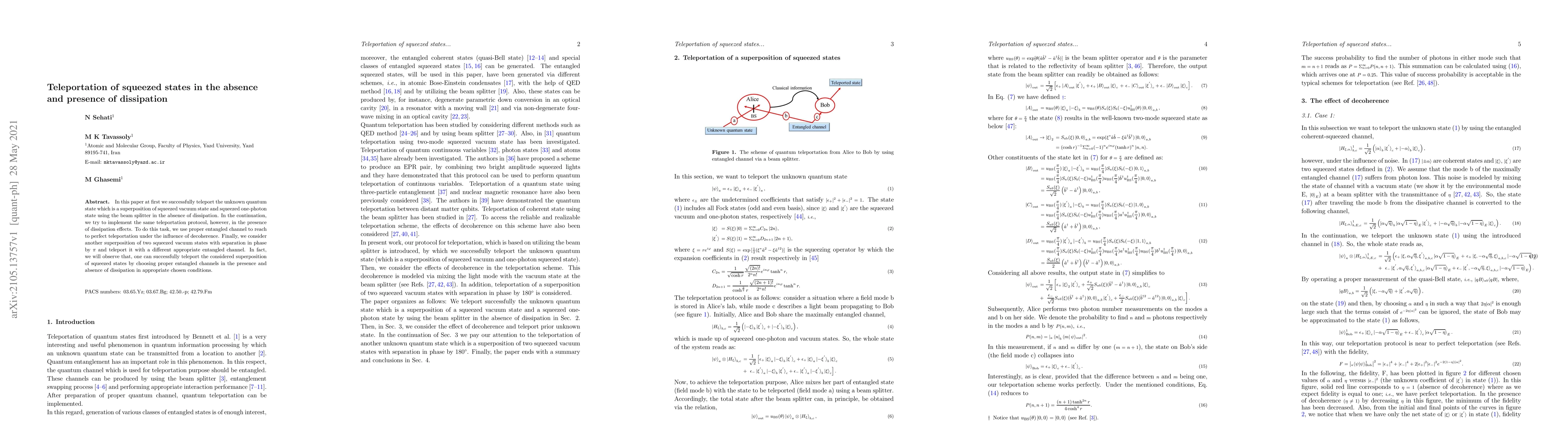 This paper demonstrates successful teleportation of squeezed states, both in ideal conditions and under the influence of dissipation. It shows that proper entangled channels can achieve perfect teleportation despite decoherence, highlighting the adaptability of the protocol for different squeezed state superpositions.