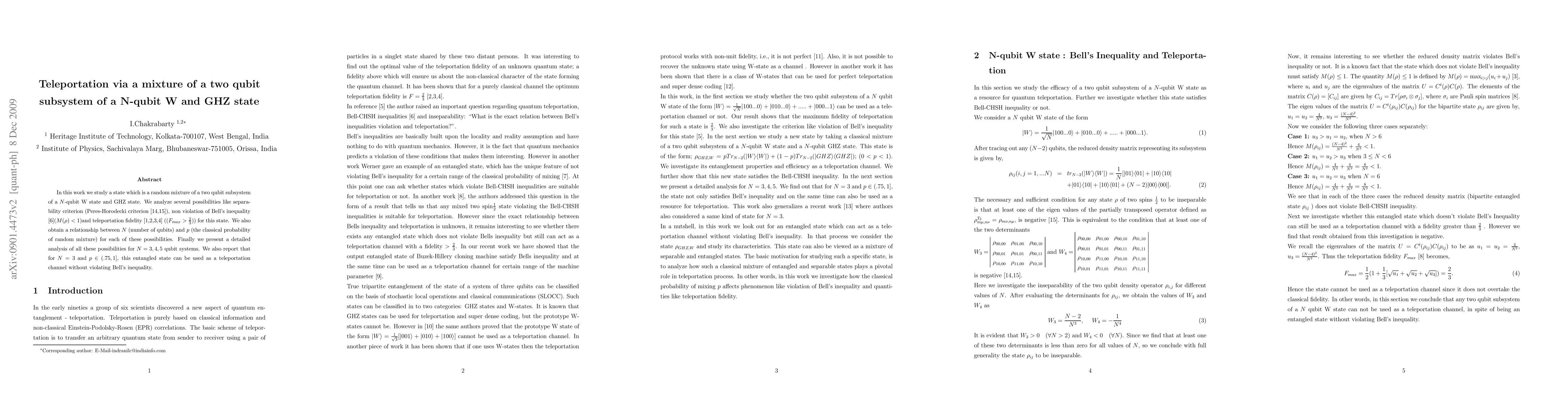 This paper investigates a mixed state composed of a two-qubit subsystem from an N-qubit W state and a GHZ state, analyzing its separability, Bell inequality compliance, and teleportation fidelity. It finds that for N=3 and certain probabilities, the state can enable teleportation without violating Bell's inequality.