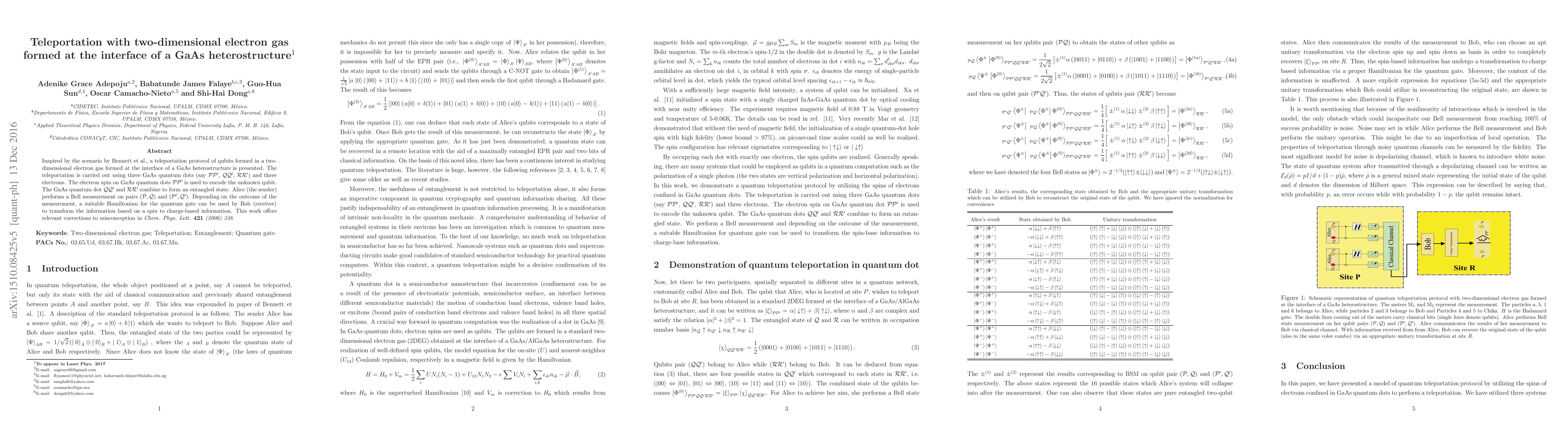 Inspired by the scenario by Bennett et al., a teleportation protocol of qubits formed in a two-dimensional electron gas formed at the interface of a GaAs heterostructure is presented. The teleportation is carried out using three GaAs quantum dots (say $\mathcal{P}\mathcal{P}'$, $\mathcal{Q}\mathcal{Q}'$, $\mathcal{R}\mathcal{R}'$) and three electrons. The electron spin on GaAs quantum dots $\mathcal{P}\mathcal{P}'$ is used to encode the unknown qubit. The GaAs quantum dot $\mathcal{Q}\mathcal{Q}'$ and $\mathcal{R}\mathcal{R}'$ combine to form {an} entangled state. Alice (the sender) performs a Bell measurement on pairs ($\mathcal{P},\mathcal{Q}$) and ($\mathcal{P}',\mathcal{Q}'$). Depending on the outcome of {the} measurement, a suitable Hamiltonian for the quantum gate can be used by Bob (receiver) to transform the information based on {a} spin to charge-based information. This work offers relevant corrections to misconception in {\it Chem. Phys. Lett. {\bf421} (2006) 338.