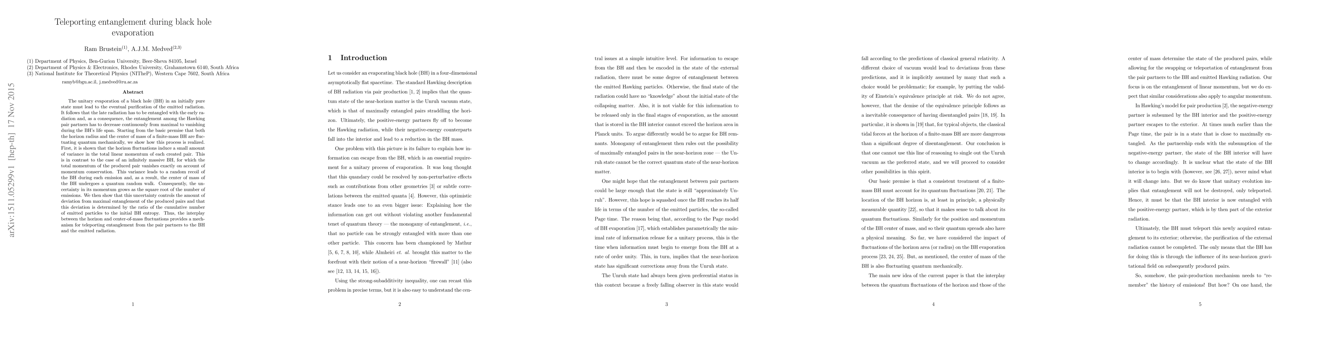 The unitary evaporation of a black hole (BH) in an initially pure state must lead to the eventual purification of the emitted radiation. It follows that the late radiation has to be entangled with the early radiation and, as a consequence, the entanglement among the Hawking pair partners has to decrease continuously from maximal to vanishing during the BH's life span. Starting from the basic premise that both the horizon radius and the center of mass of a finite-mass BH are fluctuating quantum mechanically, we show how this process is realized. First, it is shown that the horizon fluctuations induce a small amount of variance in the total linear momentum of each created pair. This is in contrast to the case of an infinitely massive BH, for which the total momentum of the produced pair vanishes exactly on account of momentum conservation. This variance leads to a random recoil of the BH during each emission and, as a result, the center of mass of the BH undergoes a quantum random walk. Consequently, the uncertainty in its momentum grows as the square root of the number of emissions. We then show that this uncertainty controls the amount of deviation from maximal entanglement of the produced pairs and that this deviation is determined by the ratio of the cumulative number of emitted particles to the initial BH entropy. Thus, the interplay between the horizon and center-of-mass fluctuations provides a mechanism for teleporting entanglement from the pair partners to the BH and the emitted radiation.