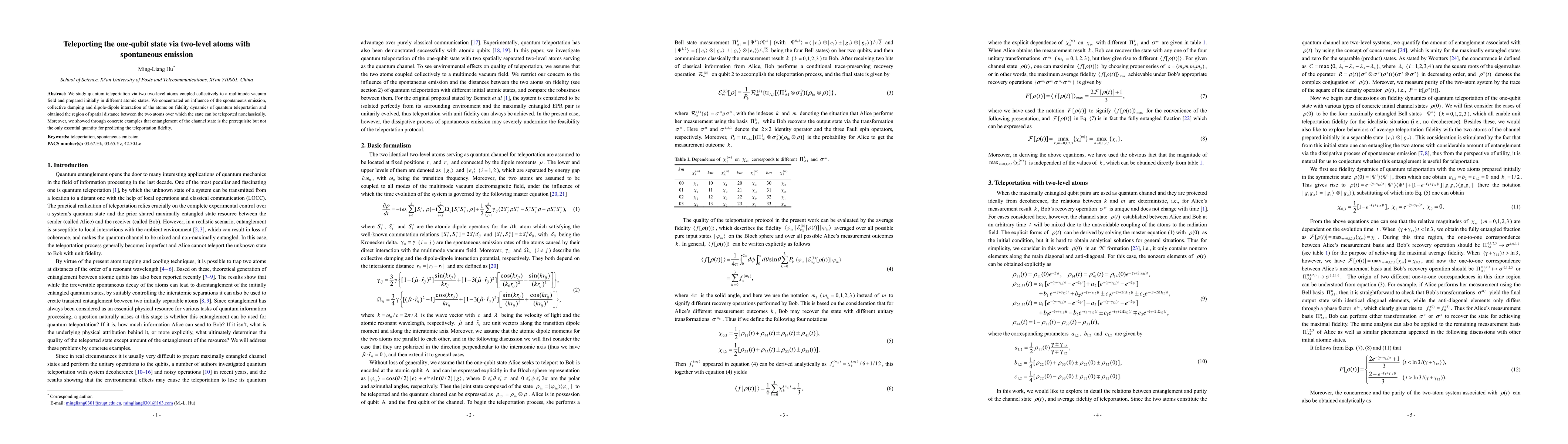 Researchers studied quantum teleportation using two-level atoms with spontaneous emission, finding that entanglement of the channel state is crucial for successful teleportation. They also identified a spatial distance range where non-classical teleportation is possible.