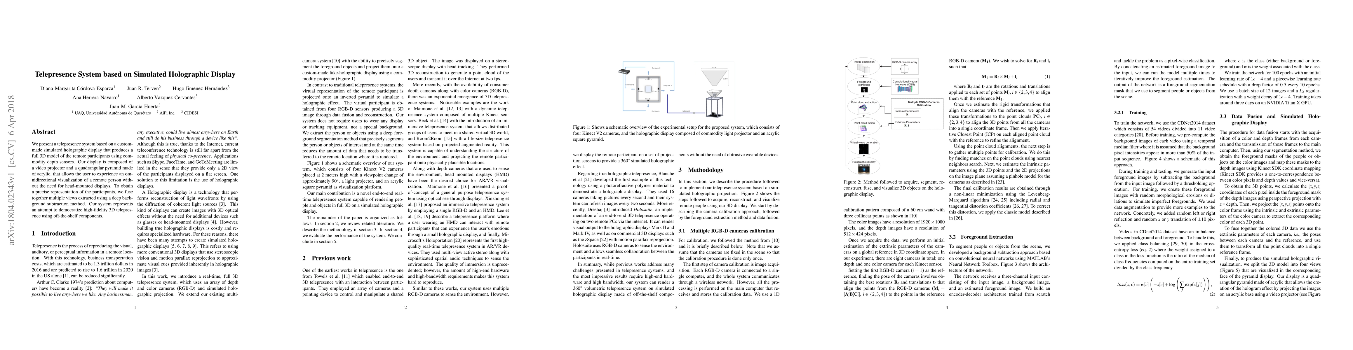 We present a telepresence system based on a custom-made simulated holographic display that produces a full 3D model of the remote participants using commodity depth sensors. Our display is composed of a video projector and a quadrangular pyramid made of acrylic, that allows the user to experience an omnidirectional visualization of a remote person without the need for head-mounted displays. To obtain a precise representation of the participants, we fuse together multiple views extracted using a deep background subtraction method. Our system represents an attempt to democratize high-fidelity 3D telepresence using off-the-shelf components.