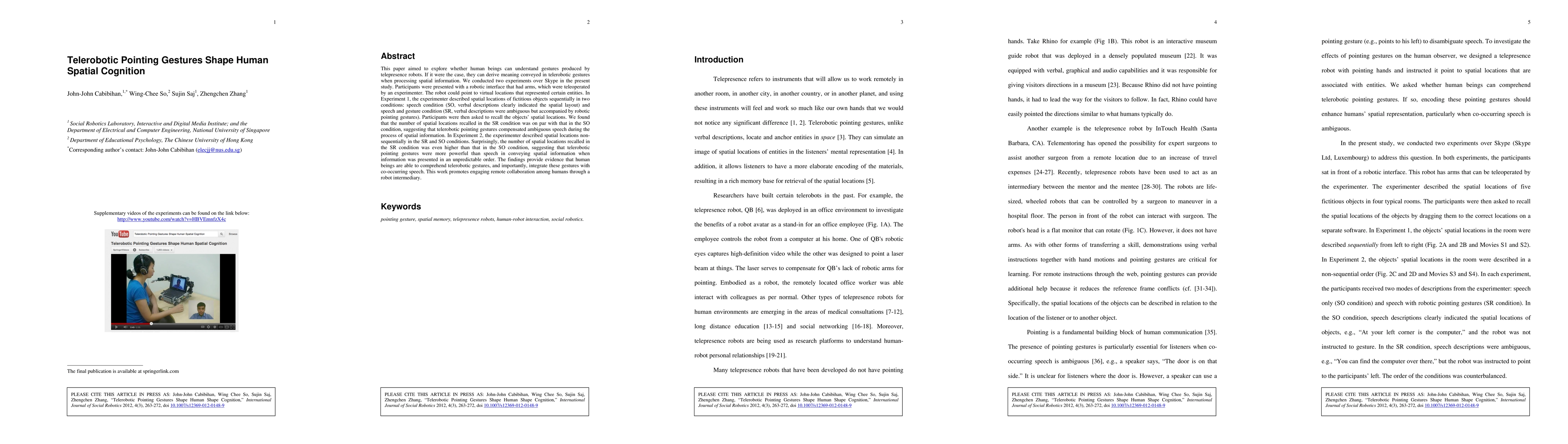 This paper aimed to explore whether human beings can understand gestures produced by telepresence robots. If it were the case, they can derive meaning conveyed in telerobotic gestures when processing spatial information. We conducted two experiments over Skype in the present study. Participants were presented with a robotic interface that had arms, which were teleoperated by an experimenter. The robot could point to virtual locations that represented certain entities. In Experiment 1, the experimenter described spatial locations of fictitious objects sequentially in two conditions: speech condition (SO, verbal descriptions clearly indicated the spatial layout) and speech and gesture condition (SR, verbal descriptions were ambiguous but accompanied by robotic pointing gestures). Participants were then asked to recall the objects' spatial locations. We found that the number of spatial locations recalled in the SR condition was on par with that in the SO condition, suggesting that telerobotic pointing gestures compensated ambiguous speech during the process of spatial information. In Experiment 2, the experimenter described spatial locations non-sequentially in the SR and SO conditions. Surprisingly, the number of spatial locations recalled in the SR condition was even higher than that in the SO condition, suggesting that telerobotic pointing gestures were more powerful than speech in conveying spatial information when information was presented in an unpredictable order. The findings provide evidence that human beings are able to comprehend telerobotic gestures, and importantly, integrate these gestures with co-occurring speech. This work promotes engaging remote collaboration among humans through a robot intermediary.