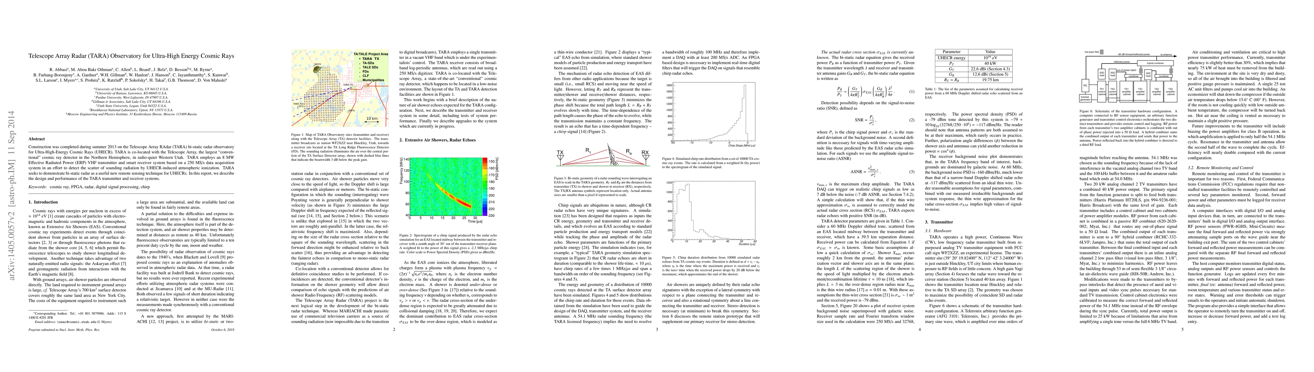 Construction was completed during summer 2013 on the Telescope Array RAdar (TARA) bi-static radar observatory for Ultra-High Energy Cosmic Rays (UHECR). TARA is co-located with the Telescope Array, the largest "conventional" cosmic ray detector in the Northern Hemisphere, in radio-quiet Western Utah. TARA employs an 8 MW Effective Radiated Power (ERP) VHF transmitter and smart receiver system based on a 250 MS/s data acquisition system in an effort to detect the scatter of sounding radiation by UHECR-induced atmospheric ionization. TARA seeks to demonstrate bi-static radar as a useful new remote sensing technique for UHECRs, extending their detection aperture far beyond what is accessible by conventional means. In this report, we describe the design and performance of the TARA transmitter and receiver systems.