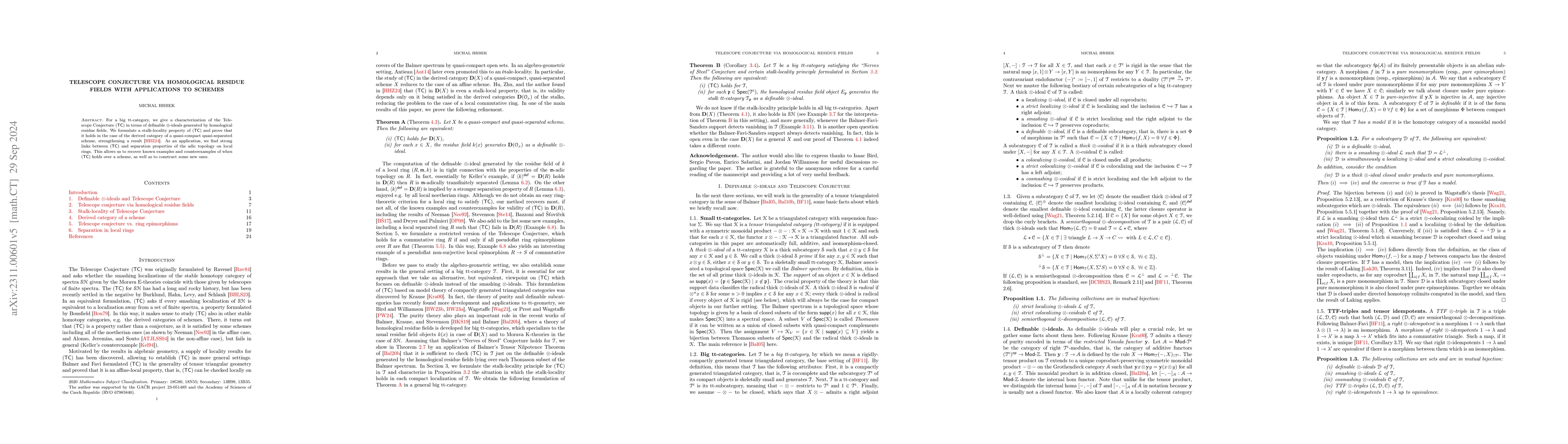 The paper characterizes the Telescope Conjecture in terms of definable tensor-ideals generated by homological residue fields and proves its stalk-locality in the derived category of quasi-compact quasi-separated schemes. It establishes connections between the conjecture and separation properties of adic topology on local rings, providing new examples and counterexamples.