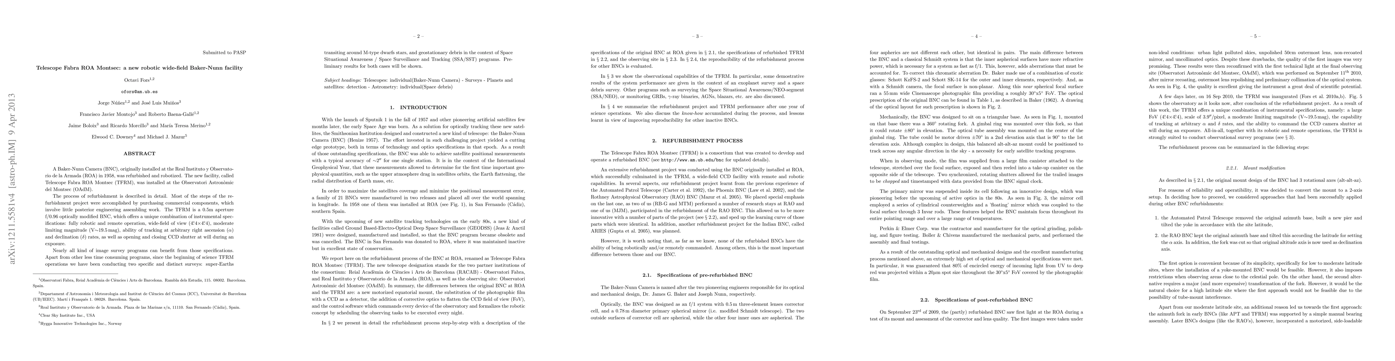 The Telescope Fabra ROA Montsec (TFRM) is a refurbished and roboticized Baker-Nunn Camera originally installed in 1958, now offering a wide-field of view and fully remote operation. TFRM conducts surveys for super-Earths transiting M-type stars and geostationary debris for Space Situational Awareness.