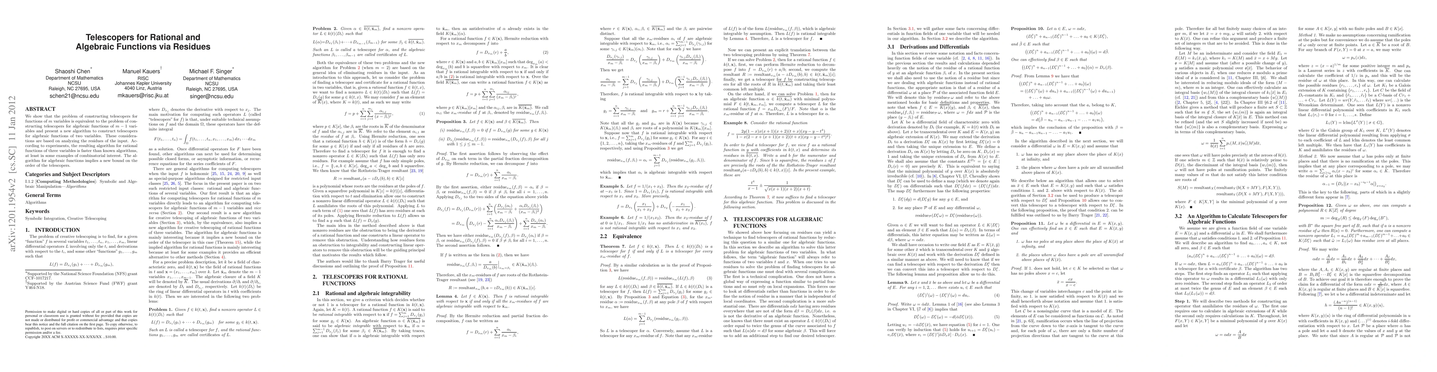 We show that the problem of constructing telescopers for functions of m variables is equivalent to the problem of constructing telescopers for algebraic functions of m -1 variables and present a new algorithm to construct telescopers for algebraic functions of two variables. These considerations are based on analyzing the residues of the input. According to experiments, the resulting algorithm for rational functions of three variables is faster than known algorithms, at least in some examples of combinatorial interest. The algorithm for algebraic functions implies a new bound on the order of the telescopers.