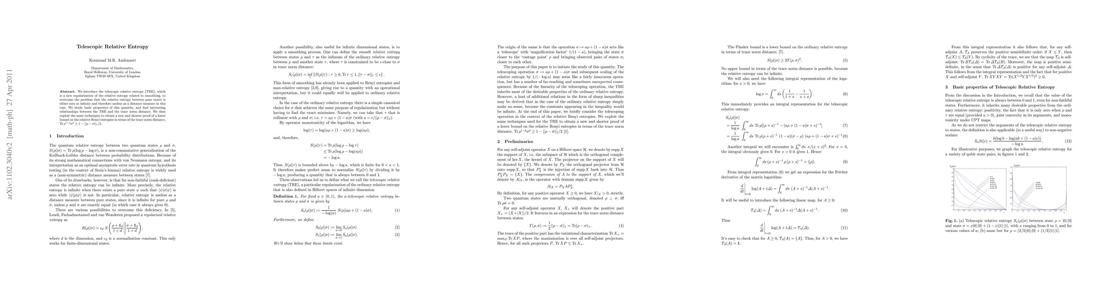 The telescopic relative entropy (TRE) is a novel regularization of relative entropy designed to provide a useful distance measure between pure quantum states. It establishes a relationship with the trace norm distance and offers a concise proof for a lower bound on the relative Rényi entropies.