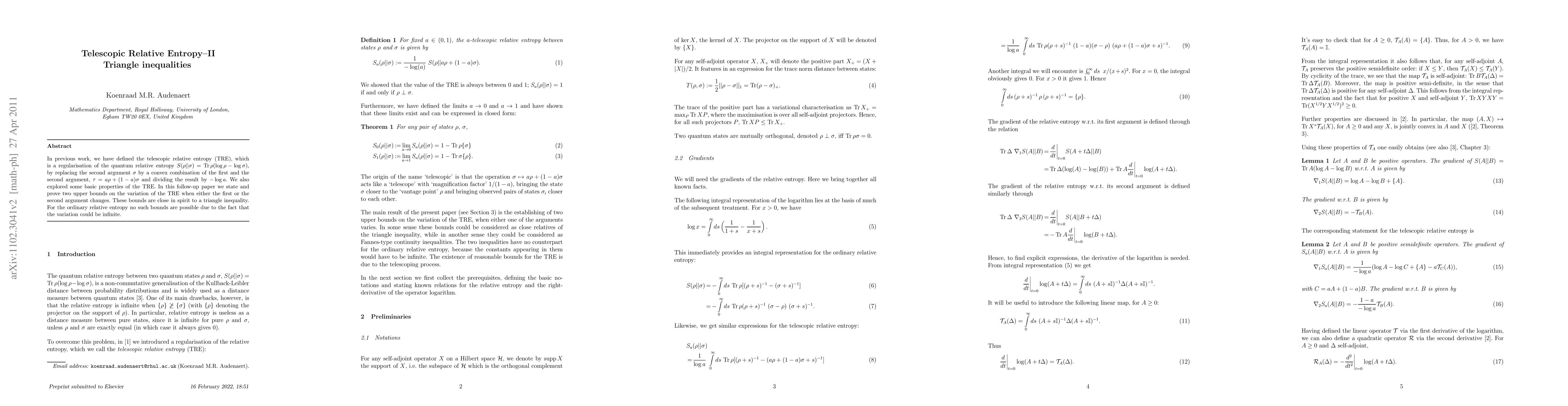 In previous work (see arxiv:1102.3040), we have defined the telescopic relative entropy (TRE), which is a regularisation of the quantum relative entropy $S(\rho||\sigma)=\trace\rho(\log\rho-\log\sigma)$, by replacing the second argument $\sigma$ by a convex combination of the first and the second argument, $\tau=a\rho+(1-a)\sigma$ and dividing the result by $-\log a$. We also explored some basic properties of the TRE. In this follow-up paper we state and prove two upper bounds on the variation of the TRE when either the first or the second argument changes. These bounds are close in spirit to a triangle inequality. For the ordinary relative entropy no such bounds are possible due to the fact that the variation could be infinite.