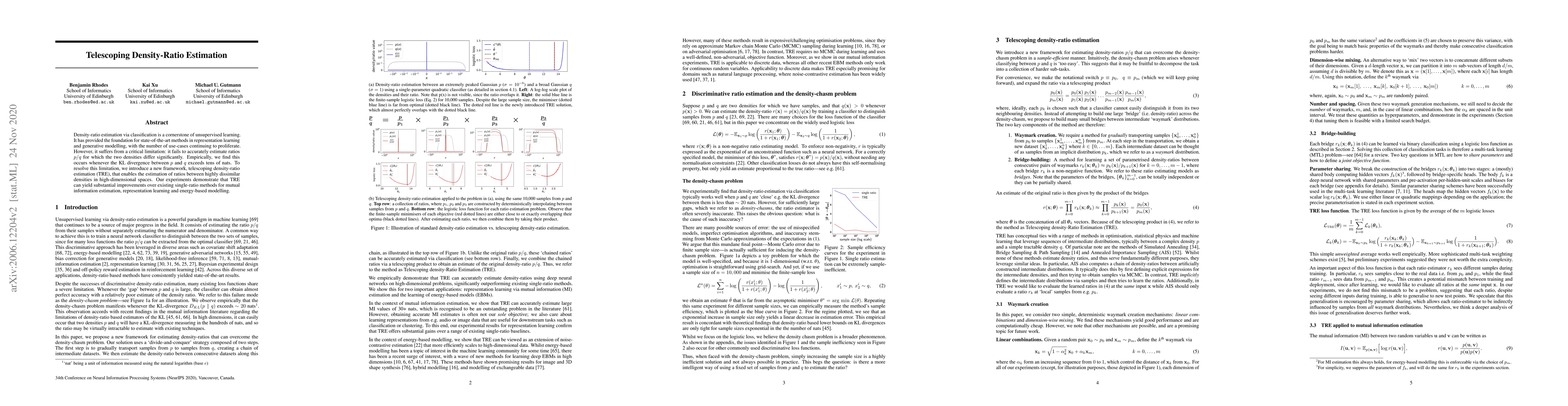 This paper introduces telescoping density-ratio estimation (TRE), a new framework to accurately estimate ratios between highly dissimilar densities, addressing the limitation of existing methods that fail when KL divergence exceeds tens of nats. TRE shows significant improvements over current techniques in mutual information estimation, representation learning, and energy-based modelling.