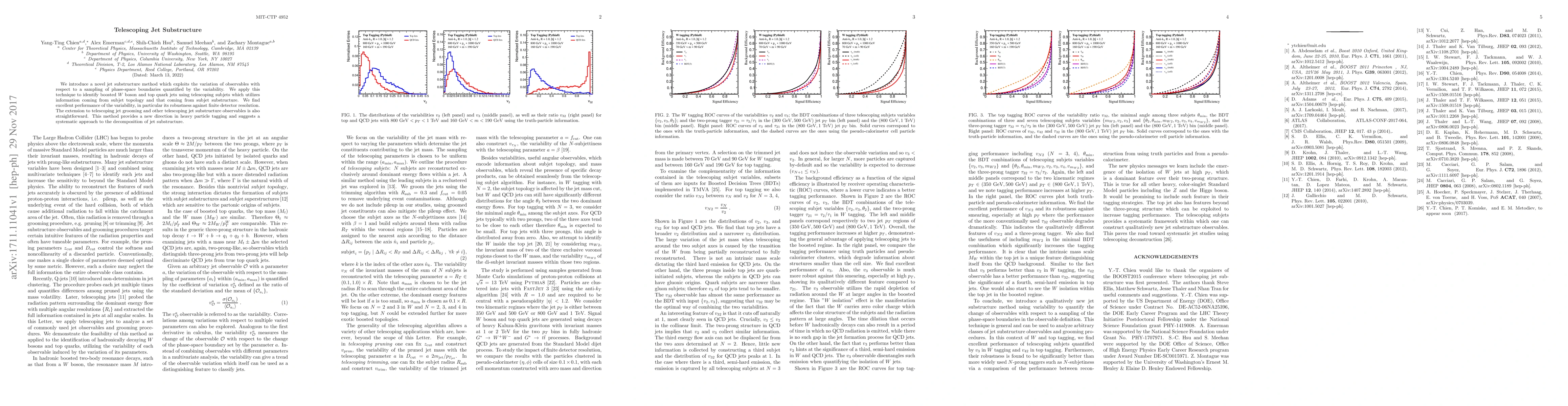 The research introduces a novel jet substructure method called 'telescoping jet substructure' that exploits variability of observables with respect to phase-space boundaries, utilizing both subjet topology and subjet substructure information. This method is applied to identify boosted W boson and top quark jets using telescoping subjets, which are groomed using the trimming algorithm with Rsub=0.3 and fcut=0.05 to remove underlying event contaminations.