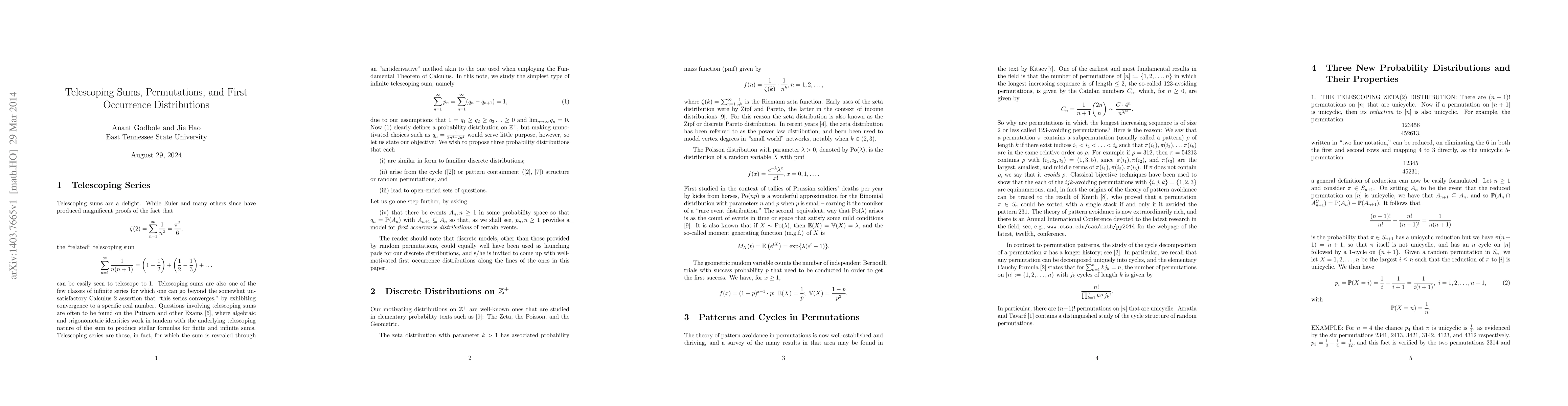 This paper explores "first occurrence" distributions derived from telescoping sums, demonstrating that they arise from concrete questions about permutation structures rather than being merely cosmetic. It provides three examples illustrating these distributions.