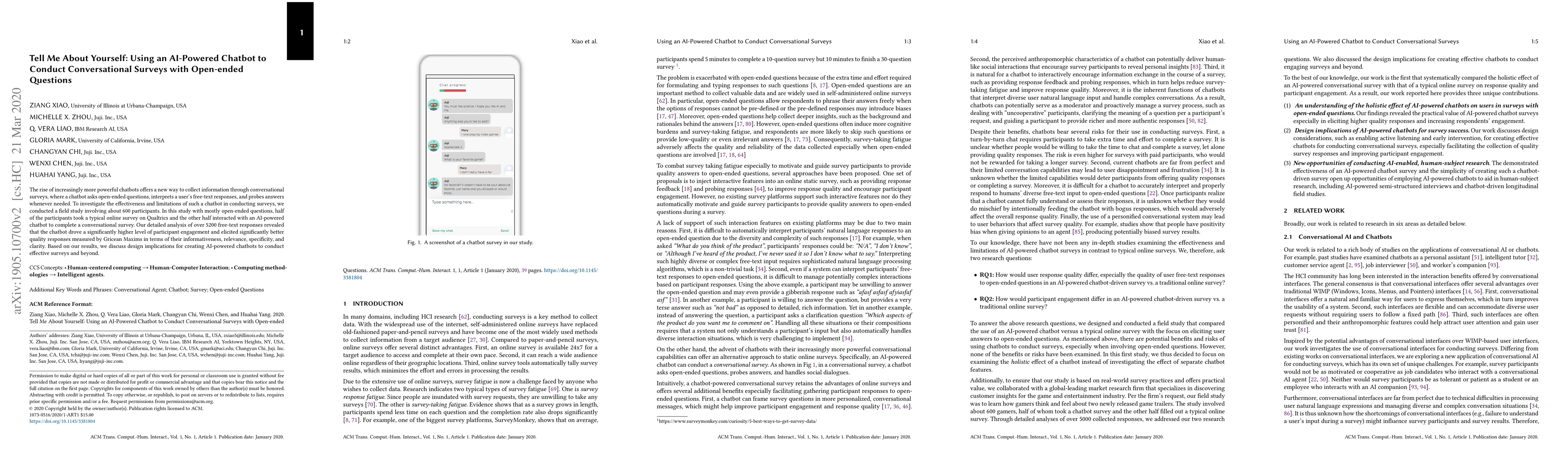 This study explores the effectiveness of AI-powered chatbots in conducting conversational surveys with open-ended questions, finding that the chatbot significantly enhances participant engagement and response quality compared to traditional online surveys. The research highlights design implications for future chatbot-based survey tools.