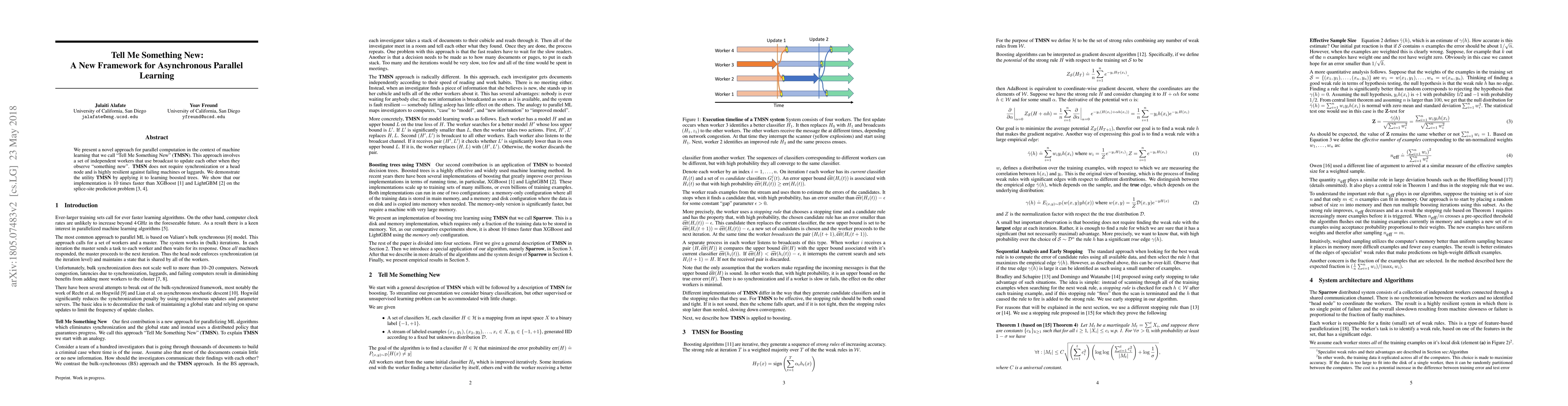 The "Tell Me Something New" (TMSN) framework introduces an asynchronous parallel computation method for machine learning that enhances speed and resilience without requiring synchronization or a head node. TMSN's implementation for learning boosted trees outperforms XGBoost and LightGBM by a factor of ten on splice-site prediction tasks.