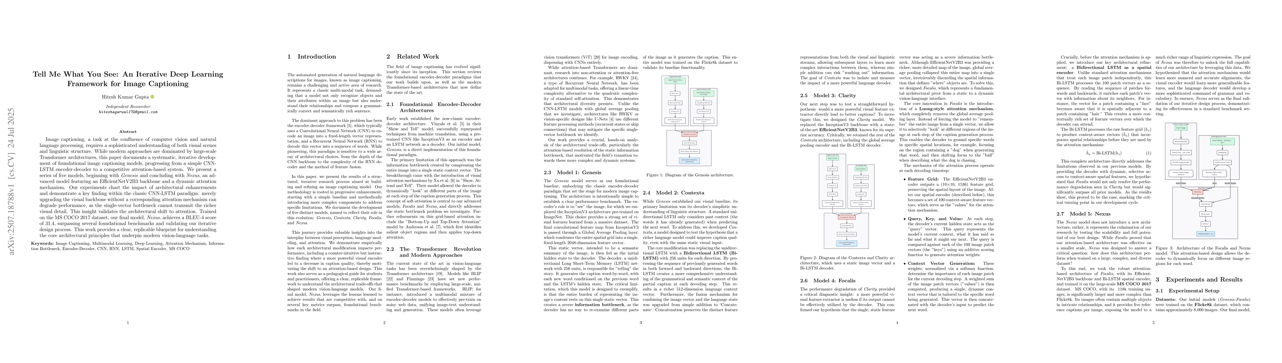 Image captioning, a task at the confluence of computer vision and natural language processing, requires a sophisticated understanding of both visual scenes and linguistic structure. While modern approaches are dominated by large-scale Transformer architectures, this paper documents a systematic, iterative development of foundational image captioning models, progressing from a simple CNN-LSTM encoder-decoder to a competitive attention-based system. We present a series of five models, beginning with Genesis and concluding with Nexus, an advanced model featuring an EfficientNetV2B3 backbone and a dynamic attention mechanism. Our experiments chart the impact of architectural enhancements and demonstrate a key finding within the classic CNN-LSTM paradigm: merely upgrading the visual backbone without a corresponding attention mechanism can degrade performance, as the single-vector bottleneck cannot transmit the richer visual detail. This insight validates the architectural shift to attention. Trained on the MS COCO 2017 dataset, our final model, Nexus, achieves a BLEU-4 score of 31.4, surpassing several foundational benchmarks and validating our iterative design process. This work provides a clear, replicable blueprint for understanding the core architectural principles that underpin modern vision-language tasks.