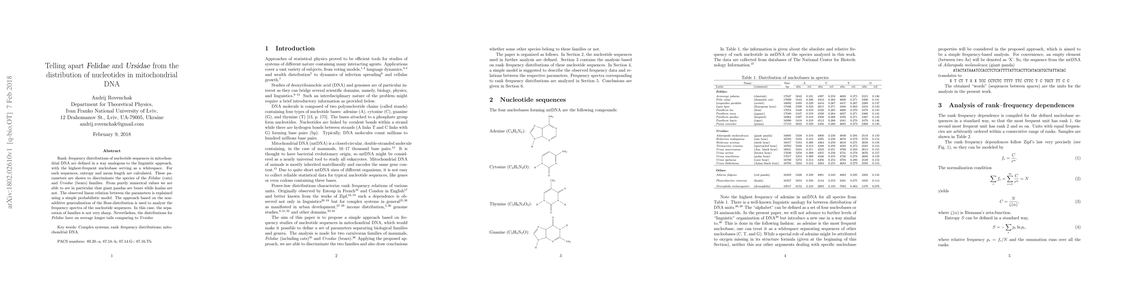 Rank--frequency distributions of nucleotide sequences in mitochondrial DNA are defined in a way analogous to the linguistic approach, with the highest-frequent nucleobase serving as a whitespace. For such sequences, entropy and mean length are calculated. These parameters are shown to discriminate the species of the Felidae (cats) and Ursidae (bears) families. From purely numerical values we are able to see in particular that giant pandas are bears while koalas are not. The observed linear relation between the parameters is explained using a simple probabilistic model. The approach based on the nonadditive generalization of the Bose-distribution is used to analyze the frequency spectra of the nucleotide sequences. In this case, the separation of families is not very sharp. Nevertheless, the distributions for Felidae have on average longer tails comparing to Ursidae.