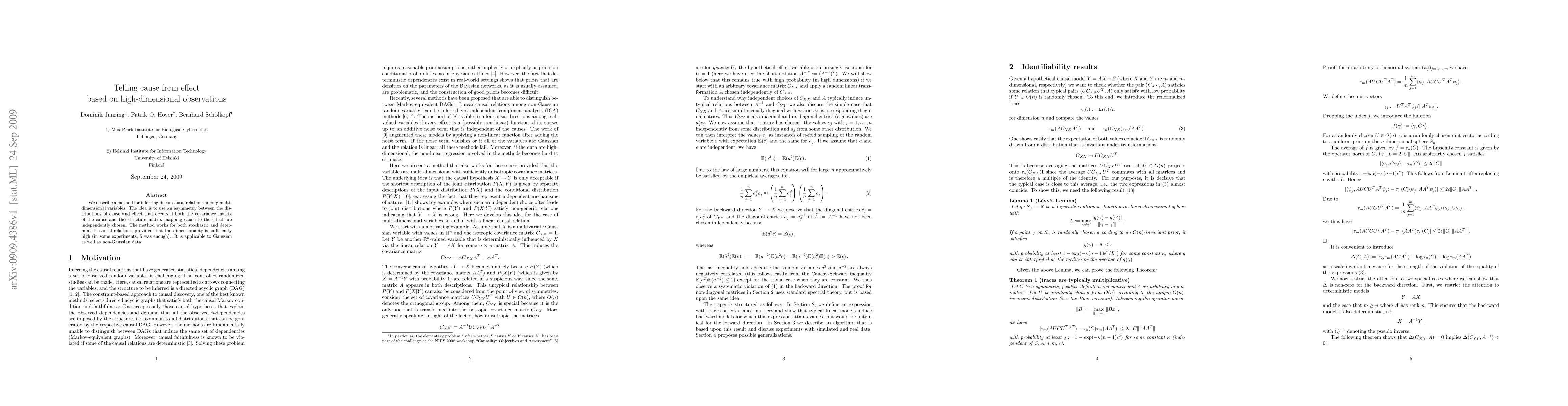 We describe a method for inferring linear causal relations among multi-dimensional variables. The idea is to use an asymmetry between the distributions of cause and effect that occurs if both the covariance matrix of the cause and the structure matrix mapping cause to the effect are independently chosen. The method works for both stochastic and deterministic causal relations, provided that the dimensionality is sufficiently high (in some experiments, 5 was enough). It is applicable to Gaussian as well as non-Gaussian data.
