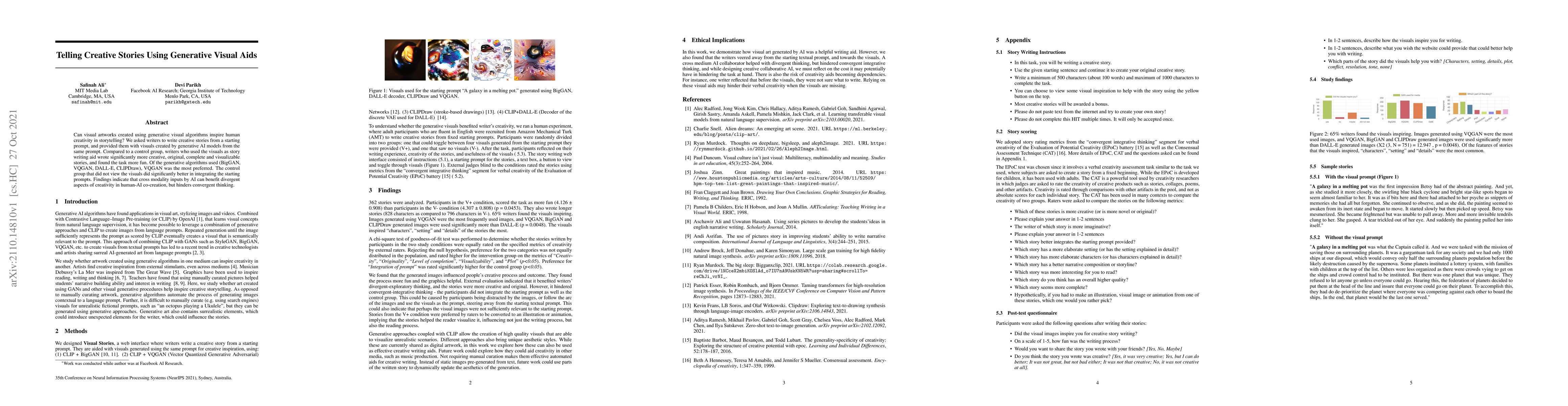 Researchers found that generative visual aids significantly enhance creative, original, and complete storytelling by writers, compared to a control group without visuals. While visual aids made the task more enjoyable, they were less effective in integrating initial prompts, suggesting AI-generated inputs boost divergent but not convergent thinking in human-AI collaborative creativity.