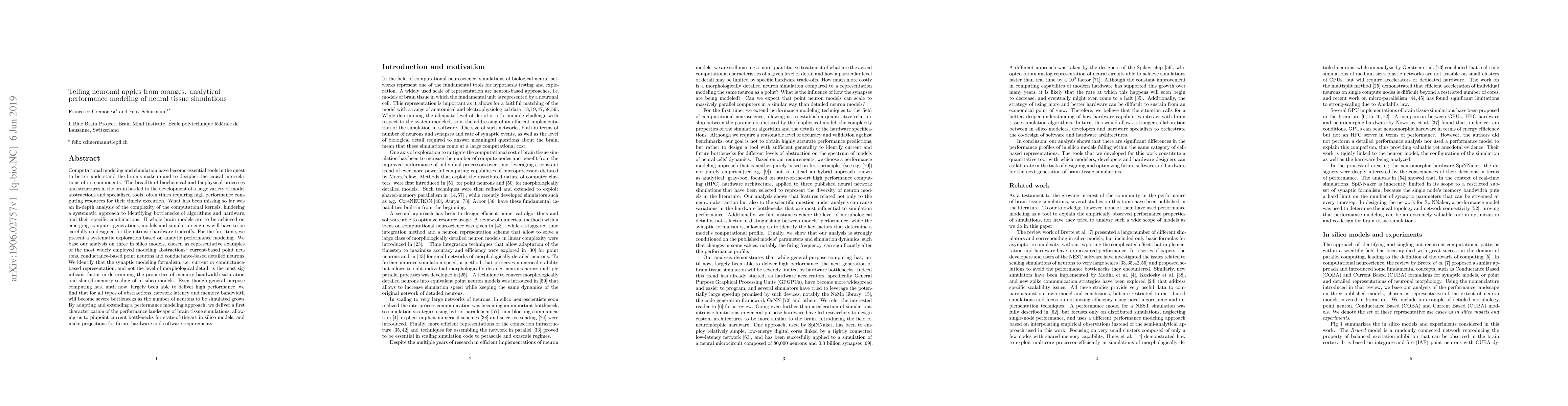 Computational modeling and simulation have become essential tools in the quest to better understand the brain's makeup and to decipher the causal interrelations of its components. The breadth of biochemical and biophysical processes and structures in the brain has led to the development of a large variety of model abstractions and specialized tools, often times requiring high performance computing resource for their timely execution. What has been missing so far was an in-depth analysis of the complexity of the computational kernels, hindering a systematic approach to identifying bottlenecks of algorithms and hardware, and their combinations. If whole brain models are to be achieved on emerging computer generations, models and simulation engines will have to be carefully co-designed for the intrinsic hardware tradeoffs. For the first time, we present a systematic exploration based on analytic performance modeling. We base our analysis on three in silico models, chosen as representative examples of the most widely employed modeling abstractions. We identify that the synaptic formalism, i.e. current or conductance based representations, and not the level of morphological detail, is the most significant factor in determining the properties of memory bandwidth saturation and shared-memory scaling of in silico models. Even though general purpose computing has, until now, largely been able to deliver high performance, we find that for all types of abstractions, network latency and memory bandwidth will become severe bottlenecks as the number of neurons to be simulated grows. By adapting and extending a performance modeling approach, we deliver a first characterization of the performance landscape of brain tissue simulations, allowing us to pinpoint current bottlenecks in state-of-the-art in silico models, and make projections for future hardware and software requirements.